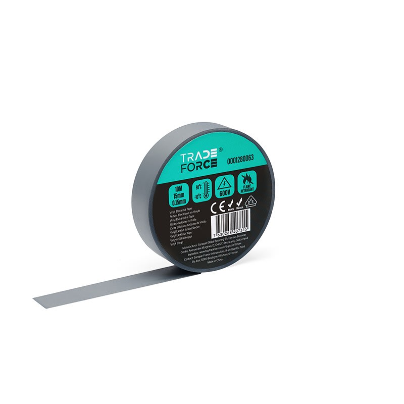 TradeForce - Ruban adhesif PVC gris, VDE, 600 V, -10C-90C, E: 0,15 mm, L: 15 mm, Long 10 m - 0001280063