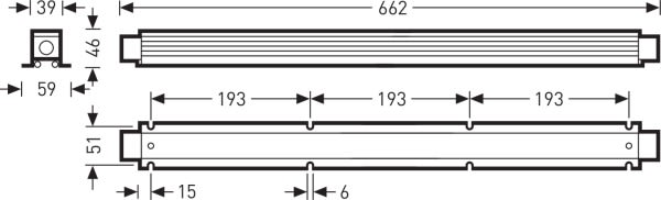 En profilé d'aluminium extrudé résistant aux intempéries. Dimensions (L x l): 662 mm x 59 mm, hauteur 46 mm.