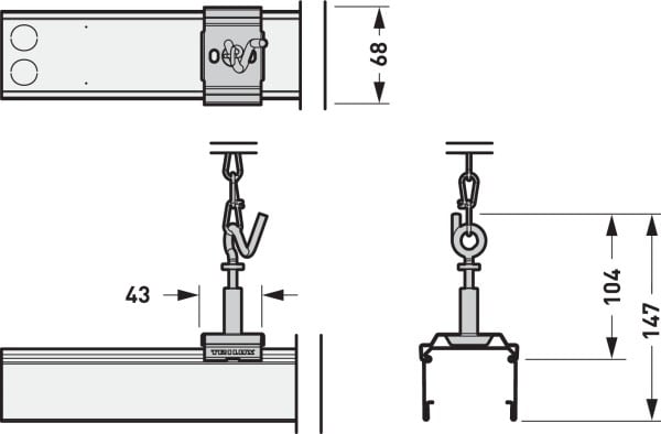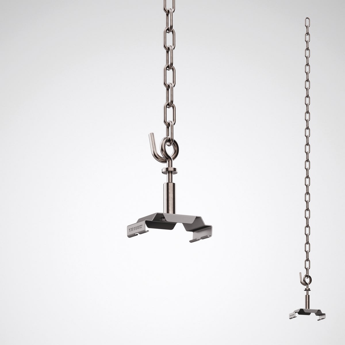 Suspension par chaîne, comprenant chaîne à maillons, galvanisé brillant (1 500 m), avec manchon de réglage et crampon de suspension E03KX. À utiliser en combinaison avec les profils-supports de la ligne E-Line PRO 078.... La surface du crampon de suspension est revêtue, Couleur gris argenté (RAL 9006).