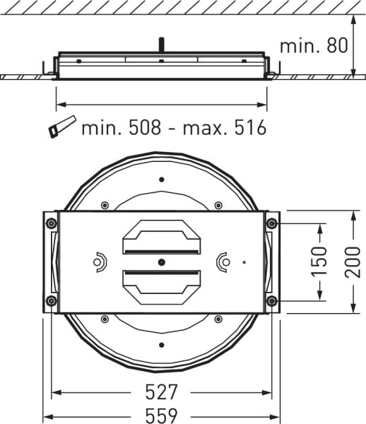 Châssis de semi-encastrement pour plafonnier rond Olisq RWD3... . Pour un encastrement dans des ouvertures découpées au plafond.