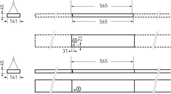 Module vierge pour luminaires suspendus Opendo H en application de ligne continue. Corps de luminaire en tôle d’acier, Recouvrement en plastique, blanc (similaire à RAL 9016). Longueur 565,3 mm, Largeur 160 mm, hauteur 47 mm. Autres longueurs possibles sur demande.