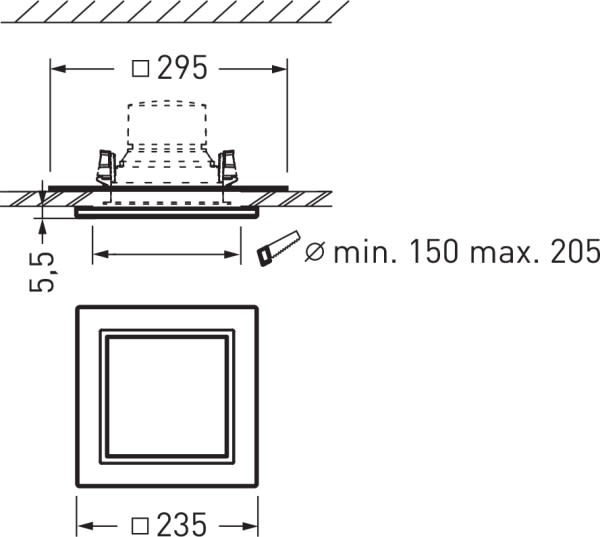 Plaque de rénovation pour l'encastrement dans des ouvertures de plafond déjà existantes et dont les dimensions ne sont pas adaptées. Longueur 235 mm Largeur 235 mm.