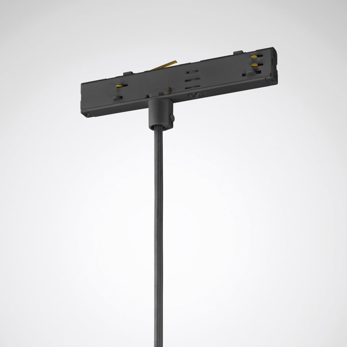Adaptateur de rail conducteur avec câble textile transparent pour la suspension de luminaires au système de rails conducteurs triphasé (DALI) Rail. Longueur du câble d’alimentation: 1800 mm. Valeur de la charge maximale: 5 kg. Pour une valeur de charge de > 5 kg, une suspension par câble supplémentaire du rail conducteur est indispensable.. Couleur de l’adaptateur de rail conducteur noir (similaire à RAL 9005). Couleur de la conduite textile noir (analogue à RAL 9005).