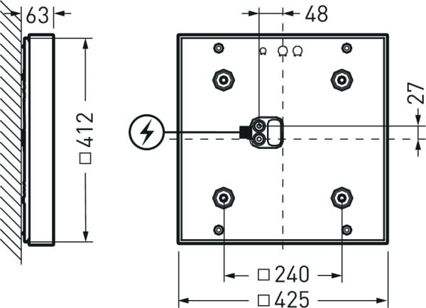 Plafonnier décoratif, carré avec un diffuseur résilient aux chocs, opale en PMMA. Version avec indice de protection augmenté IP54 sur tout le pourtour. Des habillages décoratifs sont disponibles en option pour des mises en scène de la lumière et de l'espace parfaitement adaptées. Sur demande, ils peuvent également être réalisés dans des couleurs spécifiques au client.. Développé et fabriqué en Allemagne. Convient pour une utilisation dans les entreprises certifiées HACCP, IFS et/ou BRC Global Standard Food. Avec température de surface limitée (DIN EN 60598-2-24, identifiant D). Le matériau et la structure du diffuseur de recouvrement assurent un éclairage uniforme et sans ombre de la surface du luminaire, facile à nettoyer. Avec une répartition lambertienne des intensités lumineuses. Flux lumineux du luminaire et couleur de la lumière fixes. Flux lumineux du luminaire 3000 lm, puissance raccordée 20 W, rendement lumineux maximale du luminaire 150 lm/W. Teinte de lumière blanc neutre, température de couleur (CCT) 4000 K, indice général de rendu des couleurs (IRC) Ra > 80. Tolérance de localisation chromatique (initialement MacAdam) ≤ 3 SDCM. Durée de vie assignée moyenne L80(tq 25 °C) = 100.000 h. La source lumineuse est remplaçable conformément aux exigences d'écoconception (Règlement (UE) 2019/2020). L'échange s'effectue sans outil, la source lumineuse de rechange peut être obtenue comme pièce de rechange. Corps de luminaire en tôle d’acier. Surface revêtue de blanc (RAL 9016). Dimensions (L x l x H) : 425 mm x 425 mm x 68 mm. Compartiment de la lampe anti-insectes. Classe électrique (EN 61140) : I, indice de protection (norme EN 60529) : IP54, degré de résistance aux chocs selon la norme CEI 62262 : IK06, température d’essai au fil incandescent selon la norme CEI 60695-2-11 : 650 °C. Poids: 2.9 kg. Avec driver. L'appareillage est remplaçable conformément aux exigences d'écoconception (Règlement (UE) 2019/2020). Le produit répond aux exigences essentielles des directives européennes applicables et de la loi sur la sécurité des produits et porte le marquage CE.