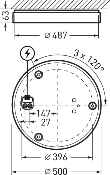 Plafonnier rond décoratif avec un diffuseur cylindrique, opale en PC, résistant aux chocs. Version avec indice de protection augmenté IP54 sur tout le pourtour. Des habillages décoratifs sont disponibles en option pour des mises en scène de la lumière et de l'espace parfaitement adaptées. Sur demande, ils peuvent également être réalisés dans des couleurs spécifiques au client.. Développé et fabriqué en Allemagne. Avec température de surface limitée (DIN EN 60598-2-24, identifiant D). Avec des accessoires à commander séparément, convenant également au montage semi-encastré (plafond avec découpe) et au montage suspendu. Pour les protéger et faciliter leur montage rapide, les composants sont disposés dans l'ordre de montage dans le carton.. Le montage rapide du recouvrement sur le corps de montage s'effectue sans outil grâce à la fermeture à clic. Le matériau et la structure du diffuseur de recouvrement assurent un éclairage uniforme et sans ombre de la surface du luminaire, facile à nettoyer. Avec une répartition lambertienne des intensités lumineuses. À légère composante indirecte pour un éclaircissement des surfaces. Flux lumineux du luminaire et couleur de la lumière fixes. Flux lumineux du luminaire 3000 lm, puissance raccordée 26 W, rendement lumineux maximale du luminaire 115 lm/W. Teinte de lumière blanc neutre, température de couleur (CCT) 4000 K, indice général de rendu des couleurs (IRC) Ra > 80. Tolérance de localisation chromatique (initialement MacAdam) ≤ 3 SDCM. Durée de vie assignée moyenne L80 (tq 25 °C) = 100.000 h., Durée de vie assignée moyenne L90 (tq 25 °C) = 50.000 h. La source lumineuse est remplaçable conformément aux exigences d'écoconception (Règlement (UE) 2019/2020). L'échange s'effectue sans outil, la source lumineuse de rechange peut être obtenue comme pièce de rechange. Corps de luminaire en tôle d’acier. Surface à revêtement blanc (similaire à RAL 9016). Diamètre du luminaire Ø 500 mm, hauteur du luminaire 68 mm. Compartiment de la lampe anti-insectes. Classe électrique (EN 61140) : I, indice de protection (norme EN 60529) : IP54, degré de résistance aux chocs selon la norme CEI 62262 : IK06, température d’essai au fil incandescent selon la norme CEI 60695-2-11 : 850 °C. Température ambiante admissible (ta): 25 °C Poids: 3.2 kg. Avec appareillage électronique, commutable. L'appareillage est remplaçable conformément aux exigences d'écoconception (Règlement (UE) 2019/2020). Le produit répond aux exigences essentielles des directives européennes applicables et de la loi sur la sécurité des produits et porte le marquage CE.