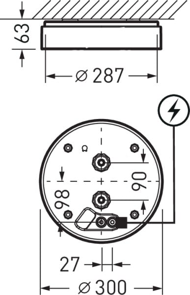Plafonnier rond décoratif avec un diffuseur cylindrique, opale en PC, résistant aux chocs. Version avec indice de protection augmenté IP54 sur tout le pourtour. Des habillages décoratifs sont disponibles en option pour des mises en scène de la lumière et de l'espace parfaitement adaptées. Sur demande, ils peuvent également être réalisés dans des couleurs spécifiques au client.. Développé et fabriqué en Allemagne. Avec température de surface limitée (DIN EN 60598-2-24, identifiant D). Avec des accessoires à commander séparément, convenant également au montage semi-encastré (plafond avec découpe) et au montage suspendu. Pour les protéger et faciliter leur montage rapide, les composants sont disposés dans l'ordre de montage dans le carton.. Le montage rapide du recouvrement sur le corps de montage s'effectue sans outil grâce à la fermeture à clic. Le matériau et la structure du diffuseur de recouvrement assurent un éclairage uniforme et sans ombre de la surface du luminaire, facile à nettoyer. Avec une répartition lambertienne des intensités lumineuses. À légère composante indirecte pour un éclaircissement des surfaces. Flux lumineux du luminaire et couleur de la lumière fixes. Flux lumineux du luminaire 950 lm, puissance raccordée 8 W, rendement lumineux maximale du luminaire 119 lm/W. Teinte de lumière blanc chaud, température de couleur (CCT) 3000 K, indice général de rendu des couleurs (IRC) Ra > 80. Tolérance de localisation chromatique (initialement MacAdam) ≤ 3 SDCM. Durée de vie assignée moyenne L80 (tq 25 °C) = 100.000 h., Durée de vie assignée moyenne L90 (tq 25 °C) = 50.000 h. La source lumineuse est remplaçable conformément aux exigences d'écoconception (Règlement (UE) 2019/2020). L'échange s'effectue sans outil, la source lumineuse de rechange peut être obtenue comme pièce de rechange. Corps de luminaire en tôle d’acier. Surface à revêtement blanc (similaire à RAL 9016). Diamètre du luminaire Ø 300 mm, hauteur du luminaire 68 mm. Compartiment de la lampe anti-insectes. Classe électrique (EN 61140) : I, indice de protection (norme EN 60529) : IP54, degré de résistance aux chocs selon la norme CEI 62262 : IK06, température d’essai au fil incandescent selon la norme CEI 60695-2-11 : 850 °C. Température ambiante admissible (ta): 25 °C Poids: 1.2 kg. Avec appareillage électronique, commutable. L'appareillage est remplaçable conformément aux exigences d'écoconception (Règlement (UE) 2019/2020). Le produit répond aux exigences essentielles des directives européennes applicables et de la loi sur la sécurité des produits et porte le marquage CE.