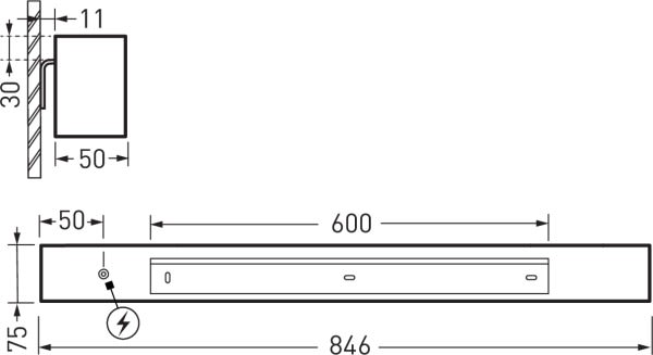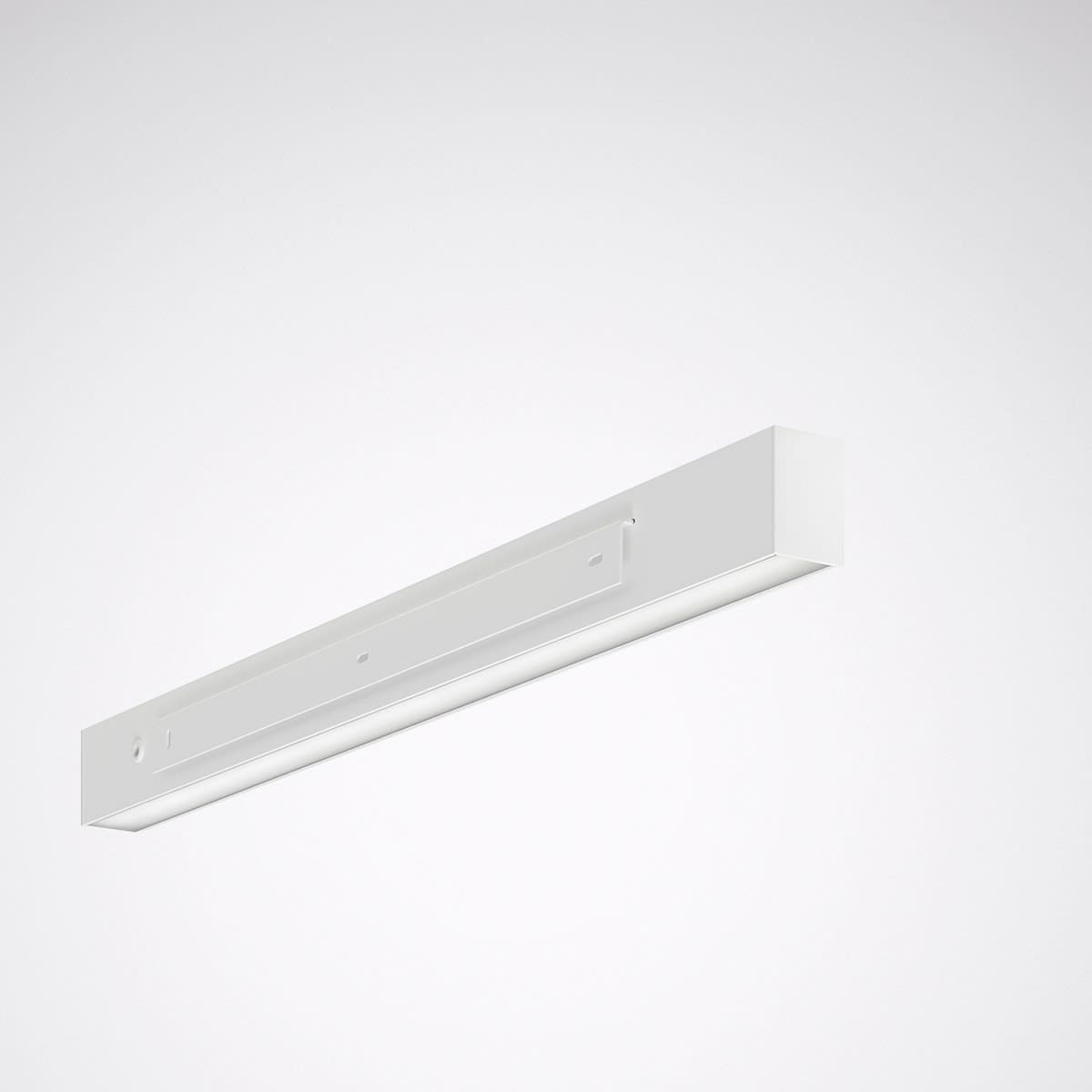 Luminaire individuel du système de canaux lumineux (montage en saillie au mur) pour une mise en scène architecturale de l’éclairage. Ce luminaire fait partie d’une gamme de luminaires encastrés, de plafonniers et de luminaires suspendus, dont l’aspect est harmonisé. Tous les accessoires indispensables au système (étriers de montage en saillie au mur et embouts frontaux) sont inclus dans la livraison. Le diffuseur en PMMA opale, finement structuré et à éclairage homogène est monté en affleurement. Avec une répartition lambertienne des intensités lumineuses. L’ouverture de sortie de lumière directe (située en bas pour un montage nominal) disperse une lumière rasante attractive sur la surface de fixation. Flux lumineux du luminaire et couleur de la lumière fixes. Flux lumineux du luminaire 3905 lm, puissance raccordée 37 W, rendement lumineux maximale du luminaire 106 lm/W. Teinte de lumière blanc chaud, température de couleur (CCT) 3000 K, indice général de rendu des couleurs (IRC) Ra > 80. Tolérance de localisation chromatique (initialement MacAdam) ≤ 3 SDCM. Durée de vie assignée moyenne L90 (tq 25 °C) = 50.000 h., Durée de vie assignée moyenne L80 (tq 25 °C) = 100.000 h. La source lumineuse est remplaçable conformément aux exigences d'écoconception (Règlement (UE) 2019/2020). Éléments de canal en profilé extrudé d’aluminium, embouts frontaux en plastique (PMMA). Surface à revêtement blanc (similaire à RAL 9016). Dimensions (L x l): 846 mm x 50 mm, hauteur du luminaire 75 mm. Classe électrique (EN 61140) : I, indice de protection (norme EN 60529) : IP20, degré de résistance aux chocs selon la norme CEI 62262 : IK03, température d’essai au fil incandescent selon la norme CEI 60695-2-11 : 650 °C. Température ambiante admissible (ta): 25 °C . Poids: 4.2 kg. Le raccordement au réseau s'effectue au moyen d'une borne à 5 pôles jusqu'à 1,5 mm2. Avec driver, dimmable (DALI). Appareillage conf. au standard DALI 2 (EN 62386). L'appareillage est remplaçable conformément aux exigences d'écoconception (Règlement (UE) 2019/2020). Ce luminaire qui est prêt au monitoring (MOR) fournit des données d’exploitation permettant une surveillance ou une maintenance prédictive, il est donc compatible avec les services de TRILUX Monitoring Services. Le produit répond aux exigences essentielles des directives européennes applicables et de la loi sur la sécurité des produits et porte le marquage CE.