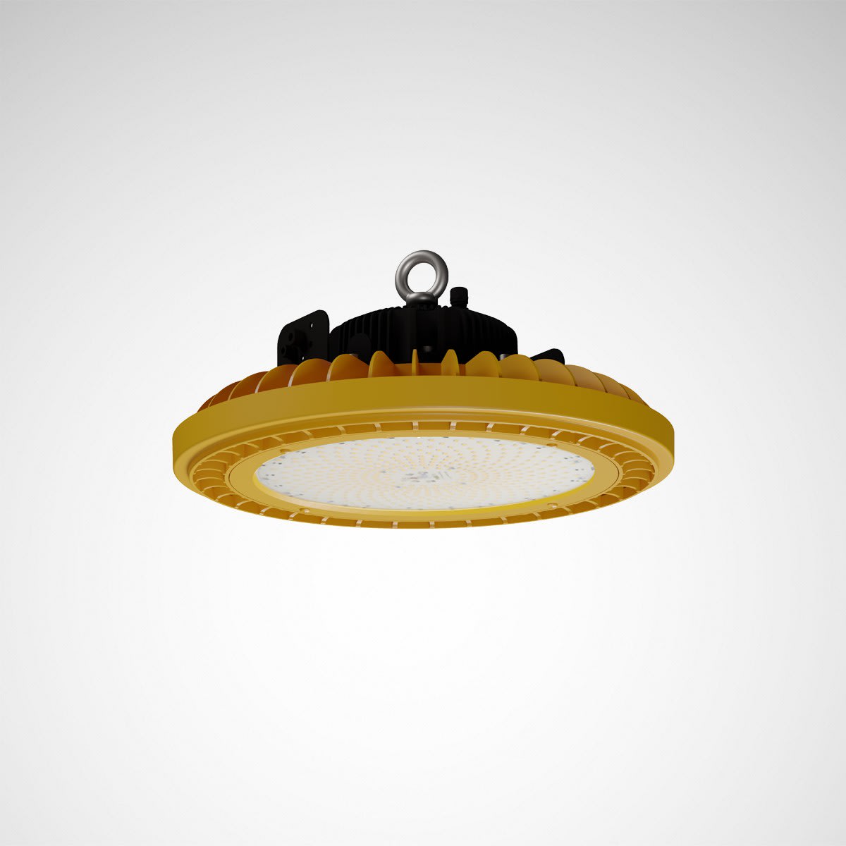 Hublot industriel robuste pour les zones à risque d’explosion. Convient pour une utilisation dans des zones qui, en fonctionnement normal, sont rarement exposées à un risque d'explosion par des gaz, des vapeurs ou des brouillards et seulement pendant une courte durée (zone 2). Un œillet de fixation est inclus dans la livraison de la version suspendue. Possibilité d’un montage au mur, au plafond, sur un mât ou un tube au moyen d’accessoires à commander séparément. Avec une répartition lambertienne des intensités lumineuses. Flux lumineux du luminaire et couleur de la lumière fixes. Flux lumineux du luminaire 23300 lm, puissance raccordée 160 W, rendement lumineux maximale du luminaire 146 lm/W. Teinte de lumière blanc neutre, température de couleur (CCT) 4000 K, indice général de rendu des couleurs (IRC) Ra > 80. Tolérance de localisation chromatique (initialement MacAdam) ≤ 3 SDCM. Durée de vie assignée moyenne L80(tq 25 °C) = 70.000 h. Corps de luminaire en alliage d’aluminium coulé ; surface protégée contre les environnements corrosifs. Surface revêtue de jaune de sécurité (RAL 1003). Vitre de fermeture en verre trempé. Diamètre du luminaire 390 mm, Hauteur du luminaire 140 mm. Classe électrique (EN 61140) : I, indice de protection (norme EN 60529) : IP66, degré de résistance aux chocs selon la norme CEI 62262 : IK08. Température ambiante admissible -32°C = Ta = +xx°C. Poids: 6.8 kg. Un raccord à visser (PA) et un câble d’alimentation de 250 mm sont inclus dans la livraison. Le luminaire convient à un fonctionnement sur un réseau à tension continue 230 V. Avec driver. Le produit répond aux exigences essentielles des directives européennes applicables et de la loi sur la sécurité des produits et porte le marquage CE.