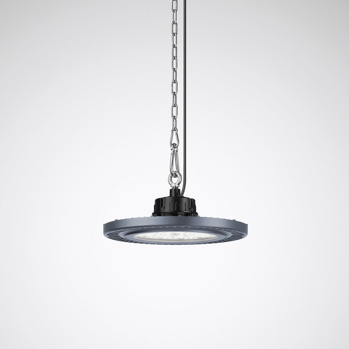 Armature industrielle LED pour montage suspendu. Avec température de surface limitée (DIN EN 60598-2-24, identifiant D). Suspension à un point sur crochet à visser, intégré au centre. Système optique avec optique à lentilles PC. Avec une unité optique par module LED. À répartition symétrique extensive des intensités lumineuses. Flux lumineux du luminaire et couleur de la lumière fixes. Flux lumineux du luminaire 12600 lm, puissance raccordée 80 W, rendement lumineux maximale du luminaire 158 lm/W. Teinte de lumière blanc neutre, température de couleur (CCT) 4000 K, indice général de rendu des couleurs (IRC) Ra > 80. Tolérance de localisation chromatique (initialement MacAdam) ≤ 4 SDCM. Durée de vie assignée moyenne L80(tq 25 °C) = 50.000 h, Durée de vie assignée moyenne L70(tq 25 °C) = 60.000 h. Boîtier robuste en Aluminium moulé sous pression avec ailettes de refroidissement intégrées. Surface revêtue en gris ardoise (RAL 7015). Diamètre du luminaire 360 mm, Hauteur du luminaire 169 mm. Température ambiante admissible (ta): -25 °C - +45 °C. Classe électrique (EN 61140) : I, indice de protection (norme EN 60529) : IP65, degré de résistance aux chocs selon la norme CEI 62262 : IK08, température d’essai au fil incandescent selon la norme CEI 60695-2-11 : 650 °C. Poids: 4.1 kg. Le raccordement secteur s'effectue au moyen d'un câble d'alimentation à 3 pôles. Avec driver. L'appareillage est remplaçable conformément aux exigences d'écoconception (Règlement (UE) 2019/2020). Le produit répond aux exigences essentielles des directives européennes applicables et de la loi sur la sécurité des produits et porte le marquage CE. Le luminaire est en outre certifié ENEC par un organisme de contrôle indépendant.