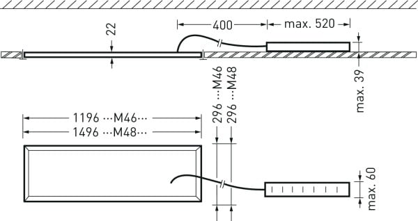 Luminaire encastré LED rectangulaire, à recouvrement microprismatique P-WW. Version M48 (300 mm x 1 500 mm). Côté pièce, le corps du luminaire affleure au système de plafond. Le système optique se compose d’une vasque en PMMA très efficace à microprismatique. Wallwasher à répartition asymétrique des intensités lumineuses. angle d’éclairage 79°. Effet lumineux harmonieux grâce à une sortie de lumière uniformément éclairée. Personnalisation de la surface de sortie de lumière (notamment par impression) et autres solutions spéciales, possibles sur demande. Avec technologie Tunable White pour la commande de la température de couleur au moyen d'un système de commande séparé (DT8). Panneaux LED équipés de LED à température de couleur blanc chaud et blanc lumière du jour. Flux lumineux du luminaire 5300 lm, puissance raccordée 46 W, rendement lumineux maximale du luminaire 115 lm/W. Teinte de lumière Tunable White (blanc chaud - blanc lumière du jour), température de couleur (CCT) Tunable White (2 700 K - 6 000 K), indice général de rendu des couleurs (IRC) Ra > 80. Tolérance de localisation chromatique (initialement MacAdam) ≤ 3 SDCM. Durée de vie assignée moyenne L80 (tq 25 °C) = 100.000 h., Durée de vie assignée moyenne L90 (tq 25 °C) = 50.000 h. La source lumineuse est remplaçable conformément aux exigences d'écoconception (Règlement (UE) 2019/2020). Corps de luminaire en profilé d’aluminium extrudé. Surface à revêtement blanc (similaire à RAL 9016). Dimensions (L x l x H) : 1496 mm, 296 mm, 22 mm. Pour créer un effet de profondeur au plafond, le cadre du luminaire dispose d’un profilé tridimensionnel. Le luminaire pêut etre recouvert d'un matériau isolant à ta 25°C, ta35 °C sana matériau isolant également utilisable. Classe électrique (EN 61140) : I, indice de protection (norme EN 60529) : IP20, Indice de protection par le dessous : IP40, degré de résistance aux chocs selon la norme CEI 62262 : IK03, température d’essai au fil incandescent selon la norme CEI 60695-2-11 : 650 °C. Température ambiante admissible (ta): 25 °C . Poids: 4.5 kg. Raccordement rapide à protection contre l’inversion de polarité, à repiquage secteur jusqu’à Ø 2,5 mm2. À driver externe pour la commutation, la gradation et la commande de la température de couleur au moyen d’un dispositif de commande DALI de type 8. Appareillage conf. au standard DALI 2 (EN 62386). L'appareillage est remplaçable conformément aux exigences d'écoconception (Règlement (UE) 2019/2020). Appareillage protégé contre le mode à vide, les raccordements incorrects, les courts-circuits, surcharges et surtempératures. Ondulation de sortie de l’appareillage ≤ 4 % pour une commande efficace du système LED et une lumière sans scintillement. Le produit répond aux exigences essentielles des directives européennes applicables et de la loi sur la sécurité des produits et porte le marquage CE.