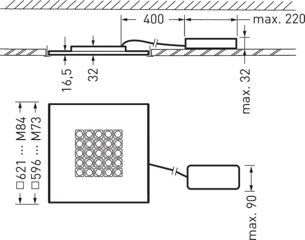 Plafonnier encastré LED, de forme carrée, à éléments lumineux en systèmes de lentilles et éléments anti-éblouissement cubiques très efficaces. Version M73 (600 mm x 600 mm). Le système optique avec une combinaison précisément adaptée de lentilles LED et d'éléments anti-éblouissants offre un très grand confort visuel accompagné d'une performance d'éclairage très élevée. À répartition symétrique limitée et extensive des intensités lumineuses. angle d’éclairage 79°. Taux d'éblouissement selon classification UGR (EN 12464-1) < 19. Compatible avec les écrans informatiques selon la norme EN 12464-1 grâce à des luminosités réduites L ≤ 3 000 cd/2 pour des angles d’éclairage supérieurs à 65 °, de manière omnidirectionnelle. Flux lumineux du luminaire et couleur de la lumière fixes. 25 éléments lumineux, en version carrée (5 x 5). Flux lumineux du luminaire 4000 lm, puissance raccordée 25 W, rendement lumineux maximale du luminaire 160 lm/W. Teinte de lumière blanc chaud, température de couleur (CCT) 3000 K, indice général de rendu des couleurs (IRC) Ra > 80. Tolérance de localisation chromatique (initialement MacAdam) ≤ 3 SDCM. Durée de vie assignée moyenne L80 (tq 25 °C) = 100.000 h., Durée de vie assignée moyenne L90 (tq 25 °C) = 50.000 h. La source lumineuse est remplaçable conformément aux exigences d'écoconception (Règlement (UE) 2019/2020). Corps de luminaire en tôle d’acier. Surface à revêtement blanc (similaire à RAL 9016). Cubes anti-éblouissement, en gris argent, à surface finement structurée (RAL 7001). Sur demande, les cubes anti-éblouissement peuvent être réalisés dans d’autres couleurs RAL. La couleur des cubes anti-éblouissement n’a aucun impact sur les caractéristiques photométriques du luminaire. Classe électrique (EN 61140) : II, indice de protection (norme EN 60529) : IP20, degré de résistance aux chocs selon la norme CEI 62262 : IK03, température d’essai au fil incandescent selon la norme CEI 60695-2-11 : 650 °C. Température ambiante admissible (ta): 25 °C . Poids: 4.5 kg. Raccordement rapide à protection contre l’inversion de polarité, à repiquage secteur jusqu’à Ø 2,5 mm2. Raccordement du ballast au luminaire au moyen d’un connecteur (Plug-and-Play). Le concept d’emballage du luminaire permet de retirer séparément l’appareillage pour son prémontage, les autres composants du luminaire restant protégés jusqu’à leur montage final. Avec driver externe dimmable (DALI). Appareillage conf. au standard DALI 2 (EN 62386). Possibilité de commutation et de gradation du luminaire au moyen de la fonction bouton-poussoir via les bornes de commande DALI (TouchDim). L'appareillage est remplaçable conformément aux exigences d'écoconception (Règlement (UE) 2019/2020). Appareillage protégé contre le mode à vide, les raccordements incorrects, les courts-circuits, surcharges et surtempératures. Ondulation de sortie de l’appareillage ≤ 4 % pour une commande efficace du système LED et une lumière sans scintillement. Ce luminaire qui est prêt au monitoring (MOR) fournit des données d’exploitation permettant une surveillance ou une maintenance prédictive, il est donc compatible avec les services de TRILUX Monitoring Services.