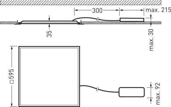 Luminaire encastré LED avec recouvrement microprismatique. Version M73 (600 mm x 600 mm). Câble antichute de sécurité inclus dans la livraison. En combinaison avec un accessoire à commander séparément, le luminaire peut également être utilisé pour un montage apparent.. Plaque de recouvrement microprismatique en PMMA. À répartition symétrique limitée et extensive des intensités lumineuses. Taux d'éblouissement selon classification UGR (EN 12464-1) < 19. Compatible avec les écrans informatiques selon la norme EN 12464-1 grâce à des luminosités réduites L ≤ 3 000 cd/2 pour des angles d’éclairage supérieurs à 65 °, de manière omnidirectionnelle. Effet lumineux harmonieux grâce à une sortie de lumière uniformément éclairée. Flux lumineux du luminaire réglable sur 4 niveaux (Multilumen). Flux lumineux du luminaire 3800 lm - 5000 lm, puissance raccordée 21 W - 29 W, rendement lumineux maximale du luminaire 181 lm/W. Teinte de lumière blanc chaud, température de couleur (CCT) 3000 K, indice général de rendu des couleurs (IRC) Ra > 80. Tolérance de localisation chromatique (initialement MacAdam) ≤ 3 SDCM. Durée de vie assignée moyenne L80 (tq 25 °C) = 70.000 h. La source lumineuse est remplaçable conformément aux exigences d'écoconception (Règlement (UE) 2019/2020). Cadre en aluminium, face arrière du corps de luminaire en tôle d’acier. Surface à revêtement blanc (similaire à RAL 9016). Dimensions (L x l): 595 mm x 595 mm, hauteur du luminaire 35 mm. Indice de protection par le dessous IP44. Classe électrique (EN 61140) : I, indice de protection (norme EN 60529) : IP20, degré de résistance aux chocs selon la norme CEI 62262 : IK03, température d’essai au fil incandescent selon la norme CEI 60695-2-11 : 650 °C. Température ambiante admissible (ta): 25 °C . Poids: 2.1 kg. Avec driver externe dimmable (DALI) Appareillage conf. au standard DALI 2 (EN 62386). Possibilité de commutation et de gradation du luminaire au moyen de la fonction bouton-poussoir via les bornes de commande DALI (TouchDim). L'appareillage est remplaçable conformément aux exigences d'écoconception (Règlement (UE) 2019/2020). Ondulation de sortie de l’appareillage ≤ 4 % pour une commande efficace du système LED et une lumière sans scintillement. Le produit répond aux exigences essentielles des directives européennes applicables et de la loi sur la sécurité des produits et porte le marquage CE. Le luminaire est en outre certifié ENEC par un organisme de contrôle indépendant.
