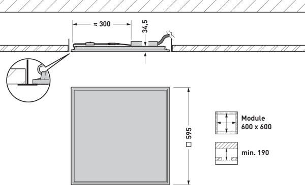 Luminaire encastré LED avec recouvrement microprismatique. Version M73 (600 mm x 600 mm). Câble antichute de sécurité inclus dans la livraison. En combinaison avec un accessoire à commander séparément, le luminaire peut également être utilisé pour un montage apparent.. Plaque de recouvrement microprismatique en PMMA. Compatible avec les écrans informatiques selon la norme EN 12464-1 grâce à des luminosités réduites L ≤ 3 000 cd/2 pour des angles d’éclairage supérieurs à 65 °, de manière omnidirectionnelle. Effet lumineux harmonieux grâce à une sortie de lumière uniformément éclairée. Flux lumineux du luminaire réglable sur 4 niveaux (Multilumen). Flux lumineux du luminaire 3600 lm - 4800 lm, puissance raccordée 21 W - 29 W, rendement lumineux maximale du luminaire 171 lm/W. Teinte de lumière blanc chaud, température de couleur (CCT) 3000 K, . Cadre en aluminium, face arrière du corps de luminaire en tôle d’acier. Surface à revêtement blanc (similaire à RAL 9016). Dimensions (L x l): x , hauteur du luminaire . Indice de protection par le dessous IP44. Classe électrique (EN 61140) : I, indice de protection (norme EN 60529) : IP20, degré de résistance aux chocs selon la norme CEI 62262 : IK03, température d’essai au fil incandescent selon la norme CEI 60695-2-11 : . . Poids: 2.1 kg. Avec appareillage électronique, commutable. Ondulation de sortie de l’appareillage ≤ 4 % pour une commande efficace du système LED et une lumière sans scintillement. Le produit répond aux exigences essentielles des directives européennes applicables et de la loi sur la sécurité des produits et porte le marquage CE. Le luminaire est en outre certifié ENEC par un organisme de contrôle indépendant.