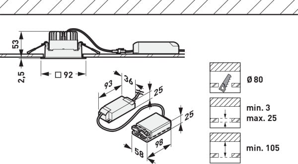 Downlight encastré carré avec bord. Convient à une utilisation comme projecteur directionnel (pivotant sur 15 °). Découpe dans le plafond Ø 80 mm, Profondeur d’encastrement 85 mm. Avec systèmes de lentilles LED. Réflecteur en plastique à revêtement blanc. Caractéristique du faisceau Flood. angle d’éclairage 36°. Mit dem separat zu erwerbenden Zubehör Amatris...HC-19... erreicht das Downlight die Bildschirmarbeitsplatztauglichkeit gemäß EN 12464-1 und die Blendungsbewertung nach UGR-Einstufung (EN 12464-1) < 19. Flux lumineux du luminaire et couleur de la lumière réglable sur 6 niveaux (Multilumen, Multicolour). Flux lumineux du luminaire 730 lm - 1250 lm, puissance raccordée 6 W - 10 W, rendement lumineux maximale du luminaire 133 lm/W. Teinte de lumière blanc chaud ou blanc neutre, température de couleur (CCT) 2700 K, 3000 K ou 4000 K, indice général de rendu des couleurs (IRC) Ra > 90. Tolérance de localisation chromatique (initialement MacAdam) ≤ 3 SDCM. Durée de vie assignée moyenne L80 (tq 25 °C) = 50.000 h. La source lumineuse est remplaçable conformément aux exigences d'écoconception (Règlement (UE) 2019/2020). Collerette et corps de refroidissement en aluminium moulé sous pression. Collerette, laquage par poudre, blanc (similaire à RAL 9016). Collerette décorative avec possibilité d'intégrer des accessoires. Dimensions extérieures de la collerette Ø , hauteur du luminaire 55.5 mm. Classe électrique (EN 61140) : II, indice de protection (norme EN 60529) : IP20, degré de résistance aux chocs selon la norme CEI 62262 : IK02, température d’essai au fil incandescent selon la norme CEI 60695-2-11 : 650 °C. Température ambiante admissible (ta): 25 °C Poids: 0.3 kg. Raccordement électrique par boîte de raccordement avec borne de raccordement à 3 pôles jusqu’à 2,5 mm2, fonction de repiquage secteur et décharge de traction intégrée. La connexion entre le luminaire et l'appareillage est enfichable. Avec appareillage électronique, commutable. L'appareillage est remplaçable conformément aux exigences d'écoconception (Règlement (UE) 2019/2020). Le produit répond aux exigences essentielles des directives européennes applicables et de la loi sur la sécurité des produits et porte le marquage CE. Le luminaire est en outre certifié ENEC par un organisme de contrôle indépendant.