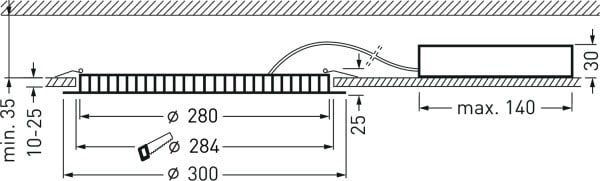 Downlight encastré rond. Découpe dans le plafond Ø 284 mm, Profondeur d’encastrement 30 mm. Avec plaque de recouvrement en PMMA opale. Avec une répartition lambertienne des intensités lumineuses. angle d’éclairage 108°. Flux lumineux du luminaire et couleur de la lumière fixes. Flux lumineux du luminaire 2550 lm, puissance raccordée 30 W, rendement lumineux maximale du luminaire 85 lm/W. Teinte de lumière blanc chaud, température de couleur (CCT) 3000 K, indice général de rendu des couleurs (IRC) Ra > 80. Tolérance de localisation chromatique (initialement MacAdam) ≤ 4 SDCM. Durée de vie assignée moyenne L80 (tq 25 °C) = 50.000 h. Corps du luminaire en fonte d’aluminium. Collerette, laquage par poudre, blanc (similaire à RAL 9016). Dimensions extérieures de la collerette Ø 300 mm, hauteur du luminaire 30 mm. Classe électrique (EN 61140) : II, indice de protection (norme EN 60529) : IP20, Indice de protection par le dessous : IP54, degré de résistance aux chocs selon la norme CEI 62262 : IK03, température d’essai au fil incandescent selon la norme CEI 60695-2-11 : 650 °C. Température ambiante admissible (ta): -20 °C à 25 °C. Poids: 0.9 kg. Avec driver externe dimmable (DALI). Appareillage conf. au standard DALI 2 (EN 62386). Possibilité de commutation et de gradation du luminaire au moyen de la fonction bouton-poussoir via les bornes de commande DALI (TouchDim). L'appareillage est remplaçable conformément aux exigences d'écoconception (Règlement (UE) 2019/2020). Le produit répond aux exigences essentielles des directives européennes applicables et de la loi sur la sécurité des produits et porte le marquage CE. Le luminaire est en outre certifié ENEC par un organisme de contrôle indépendant.