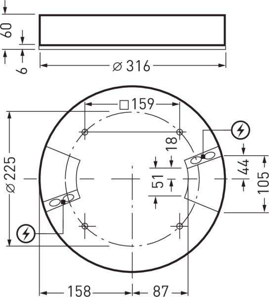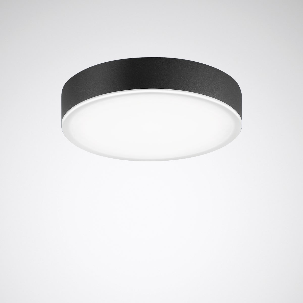 Downlight apparent rond, Hauteur de montage 60 mm. Pour montage mural et au plafond. Plaque de recouvrement en PMMA translucide. Avec une répartition lambertienne des intensités lumineuses. angle d’éclairage 104°. Effet lumineux harmonieux grâce à une sortie de lumière uniformément éclairée. Flux lumineux du luminaire et couleur de la lumière fixes. Flux lumineux du luminaire 3000 lm, puissance raccordée 23 W, rendement lumineux maximale du luminaire 130 lm/W. Teinte de lumière blanc chaud, température de couleur (CCT) 3000 K, indice général de rendu des couleurs (IRC) Ra > 80. Tolérance de localisation chromatique (initialement MacAdam) ≤ 3 SDCM. Durée de vie assignée moyenne L80 (tq 25 °C) = 70.000 h. La source lumineuse est remplaçable conformément aux exigences d'écoconception (Règlement (UE) 2019/2020). Corps du luminaire en fonte d’aluminium. Surface à revêtement anthracite (similaire à DB 703). Dimensions extérieures de la collerette Ø 316 mm, hauteur du luminaire 60 mm. Classe électrique (EN 61140) : I, indice de protection (norme EN 60529) : IP40, degré de résistance aux chocs selon la norme CEI 62262 : IK06, température d’essai au fil incandescent selon la norme CEI 60695-2-11 : 650 °C. Température ambiante admissible (ta): -20 °C à 25 °C. Poids: 2.4 kg. Avec bornier de raccordement jusqu’à 2,5 mm, dispositif antitraction et repiquage secteur. Avec driver. L'appareillage est remplaçable conformément aux exigences d'écoconception (Règlement (UE) 2019/2020). Le produit répond aux exigences essentielles des directives européennes applicables et de la loi sur la sécurité des produits et porte le marquage CE. Le luminaire est en outre certifié ENEC par un organisme de contrôle indépendant.