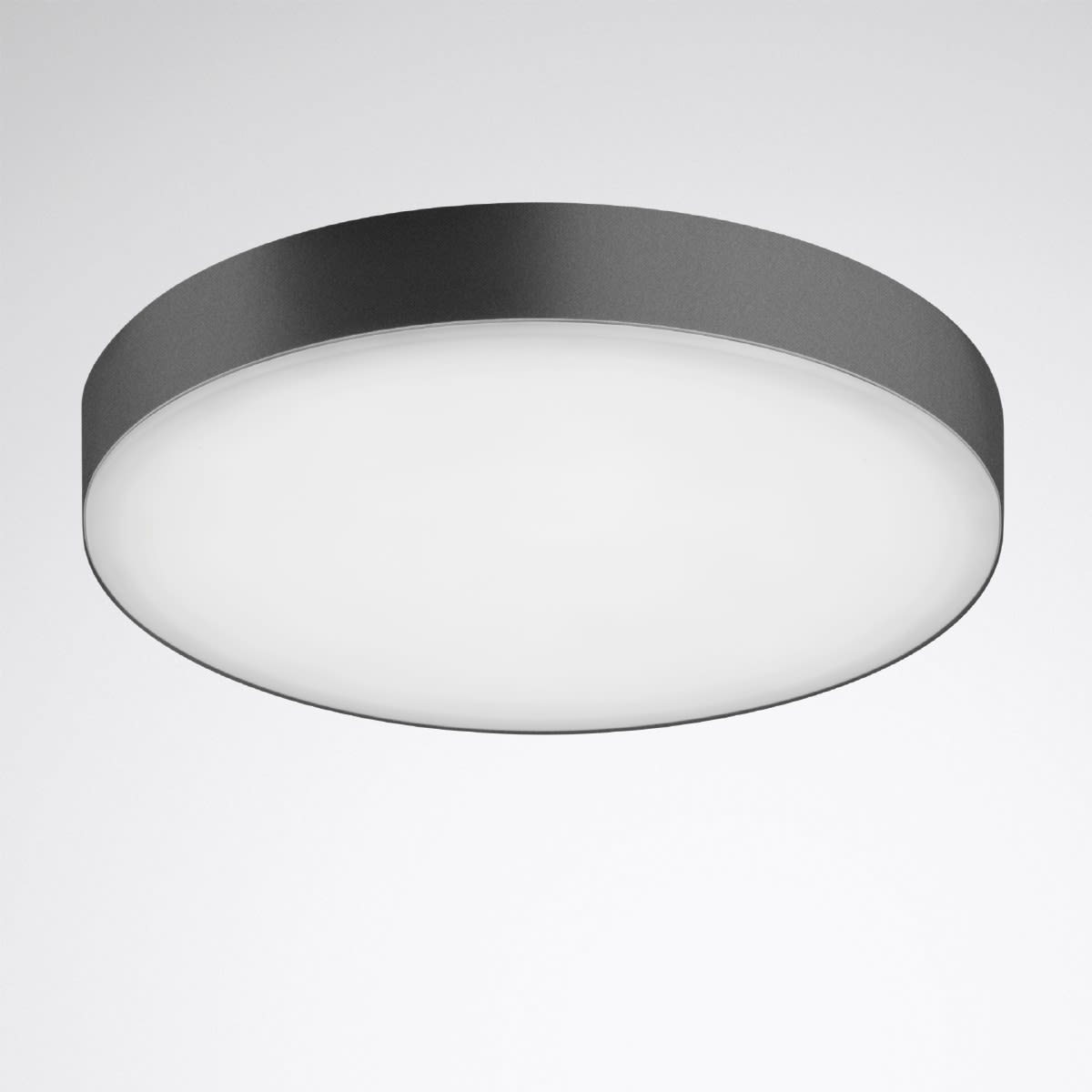 Downlight apparent rond, Hauteur de montage 65 mm. Pour montage mural et au plafond. Plaque de recouvrement en PMMA translucide. Avec une répartition lambertienne des intensités lumineuses. angle d’éclairage 104°. Effet lumineux harmonieux grâce à une sortie de lumière uniformément éclairée. Flux lumineux du luminaire et couleur de la lumière fixes. Flux lumineux du luminaire 5000 lm, puissance raccordée 39 W, rendement lumineux maximale du luminaire 128 lm/W. Teinte de lumière blanc neutre, température de couleur (CCT) 4000 K, indice général de rendu des couleurs (IRC) Ra > 80. Tolérance de localisation chromatique (initialement MacAdam) ≤ 3 SDCM. Durée de vie assignée moyenne L80 (tq 25 °C) = 70.000 h. La source lumineuse est remplaçable conformément aux exigences d'écoconception (Règlement (UE) 2019/2020). Corps du luminaire en fonte d’aluminium. Surface à revêtement anthracite (similaire à DB 703). Dimensions extérieures de la collerette Ø 445 mm, hauteur du luminaire 65 mm. Classe électrique (EN 61140) : I, indice de protection (norme EN 60529) : IP40, degré de résistance aux chocs selon la norme CEI 62262 : IK06, température d’essai au fil incandescent selon la norme CEI 60695-2-11 : 650 °C. Température ambiante admissible (ta): -20 °C à 25 °C. Poids: 4.6 kg. Avec bornier de raccordement jusqu’à 2,5 mm, dispositif antitraction et repiquage secteur. Avec driver, dimmable (DALI). Appareillage conf. au standard DALI 2 (EN 62386). Possibilité de commutation et de gradation du luminaire au moyen de la fonction bouton-poussoir via les bornes de commande DALI (TouchDim). L'appareillage est remplaçable conformément aux exigences d'écoconception (Règlement (UE) 2019/2020). Ce luminaire qui est prêt au monitoring (MOR) fournit des données d’exploitation permettant une surveillance ou une maintenance prédictive, il est donc compatible avec les services de TRILUX Monitoring Services. Le produit répond aux exigences essentielles des directives européennes applicables et de la loi sur la sécurité des produits et porte le marquage CE. Le luminaire est en outre certifié ENEC par un organisme de contrôle indépendant.