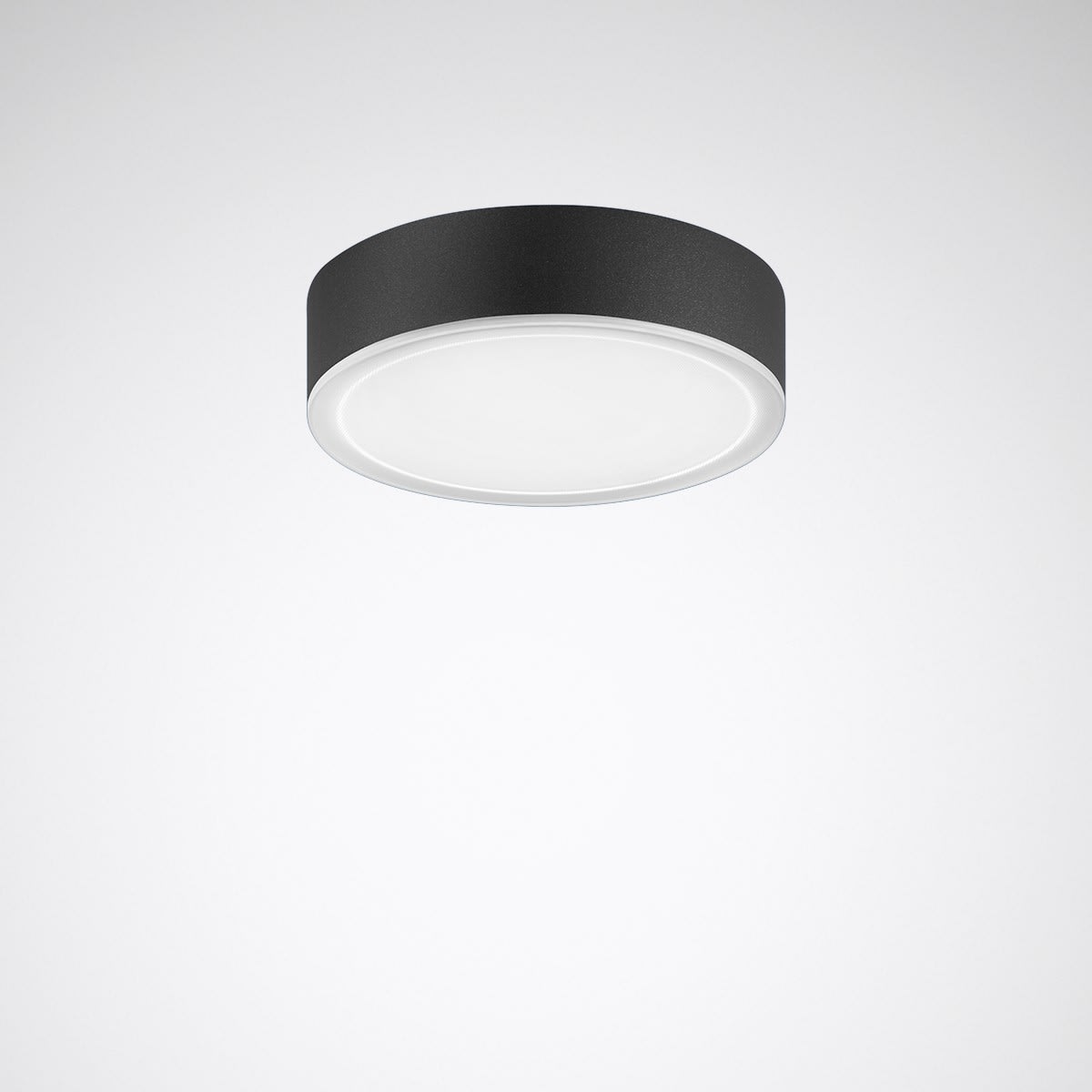 Downlight apparent rond, Hauteur de montage 60 mm. Pour montage mural et au plafond. Avec diffuseur microprismatique CDP. À répartition symétrique limitée et extensive des intensités lumineuses. angle d’éclairage 91°. Taux d'éblouissement selon classification UGR (EN 12464-1) < 19. Classification UGR selon la méthode tabulée (EN 12464-1) avec valeurs de réflexion 80/60/30. Effet lumineux harmonieux grâce à une sortie de lumière uniformément éclairée. Flux lumineux du luminaire et couleur de la lumière fixes. Flux lumineux du luminaire 1100 lm, puissance raccordée 9 W, rendement lumineux maximale du luminaire 122 lm/W. Teinte de lumière blanc neutre, température de couleur (CCT) 4000 K, indice général de rendu des couleurs (IRC) Ra > 80. Tolérance de localisation chromatique (initialement MacAdam) ≤ 3 SDCM. Durée de vie assignée moyenne L80 (tq 25 °C) = 70.000 h. La source lumineuse est remplaçable conformément aux exigences d'écoconception (Règlement (UE) 2019/2020). Corps du luminaire en fonte d’aluminium. Surface à revêtement anthracite (similaire à DB 703). Dimensions extérieures de la collerette Ø 234 mm, hauteur du luminaire 60 mm. Classe électrique (EN 61140) : I, indice de protection (norme EN 60529) : IP40, degré de résistance aux chocs selon la norme CEI 62262 : IK06, température d’essai au fil incandescent selon la norme CEI 60695-2-11 : 650 °C. Température ambiante admissible (ta): -20 °C à 25 °C. Poids: 1.7 kg. Avec bornier de raccordement jusqu’à 2,5 mm, dispositif antitraction et repiquage secteur. Avec driver, dimmable (DALI). Appareillage conf. au standard DALI 2 (EN 62386). L'appareillage est remplaçable conformément aux exigences d'écoconception (Règlement (UE) 2019/2020). Ce luminaire qui est prêt au monitoring (MOR) fournit des données d’exploitation permettant une surveillance ou une maintenance prédictive, il est donc compatible avec les services de TRILUX Monitoring Services. Le produit répond aux exigences essentielles des directives européennes applicables et de la loi sur la sécurité des produits et porte le marquage CE. Le luminaire est en outre certifié ENEC par un organisme de contrôle indépendant.
