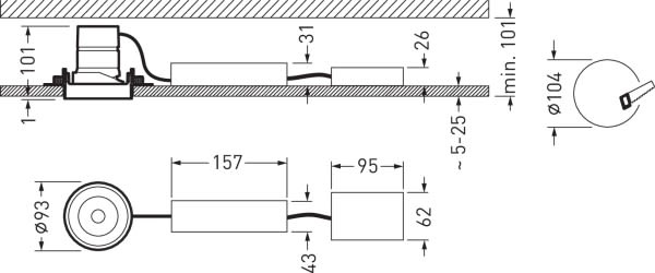 Downlight LED compact au format rond. Convient pour une utilisation dans les entreprises certifiées HACCP, IFS et/ou BRC Global Standard Food. Découpe dans le plafond Ø 104 mm, Profondeur d’encastrement 101 mm. Avec réflecteur en plastique, revêtement blanc. Le système optique avec une combinaison précisément adaptée de lentilles LED et d'éléments anti-éblouissants offre un très grand confort visuel accompagné d'une performance d'éclairage très élevée. Caractéristique du faisceau Very Wide Flood. Compatible avec les écrans informatiques selon la norme EN 12464-1 grâce à des luminosités réduites L ≤ 3 000 cd/2 pour des angles d’éclairage supérieurs à 65 °, de manière omnidirectionnelle. Guidage de la lumière via une technologie de collimateurs/lentilles. Flux lumineux du luminaire et couleur de la lumière fixes. Flux lumineux du luminaire 1500 lm, puissance raccordée 13 W, rendement lumineux maximale du luminaire 115 lm/W. Teinte de lumière blanc neutre, température de couleur (CCT) 4000 K, indice général de rendu des couleurs (IRC) Ra > 90. Tolérance de localisation chromatique (initialement MacAdam) ≤ 3 SDCM. Durée de vie assignée moyenne L80 (tq 25 °C) = 100.000 h., Durée de vie assignée moyenne L90 (tq 25 °C) = 50.000 h. La source lumineuse est remplaçable conformément aux exigences d'écoconception (Règlement (UE) 2019/2020). Boîtier et corps de refroidissement en aluminium moulé sous pression. Surface à revêtement blanc (similaire à RAL 9016). Diamètre du luminaire Ø 93 mm, hauteur du luminaire 101 mm Classe électrique (EN 61140) : II, indice de protection (norme EN 60529) : IP20, Indice de protection par le dessous : IP54, degré de résistance aux chocs selon la norme CEI 62262 : IK06, température d’essai au fil incandescent selon la norme CEI 60695-2-11 : 850 °C. Température ambiante admissible (ta): -20 °C à 25 °C. Poids: 0.6 kg. Branchement au secteur via borne enfichable avec équipement de repiquage secteur. La connexion entre le luminaire et l'appareillage est enfichable. Luminaire câblé sans halogène. Avec appareillage électronique, à gradation numérique (DALI). Appareillage conf. au standard DALI 2 (EN 62386). Possibilité de commutation et de gradation du luminaire au moyen de la fonction bouton-poussoir via les bornes de commande DALI (TouchDim). L'appareillage est remplaçable conformément aux exigences d'écoconception (Règlement (UE) 2019/2020). Le produit répond aux exigences essentielles des directives européennes applicables et de la loi sur la sécurité des produits et porte le marquage CE. Le luminaire est en outre certifié ENEC par un organisme de contrôle indépendant.