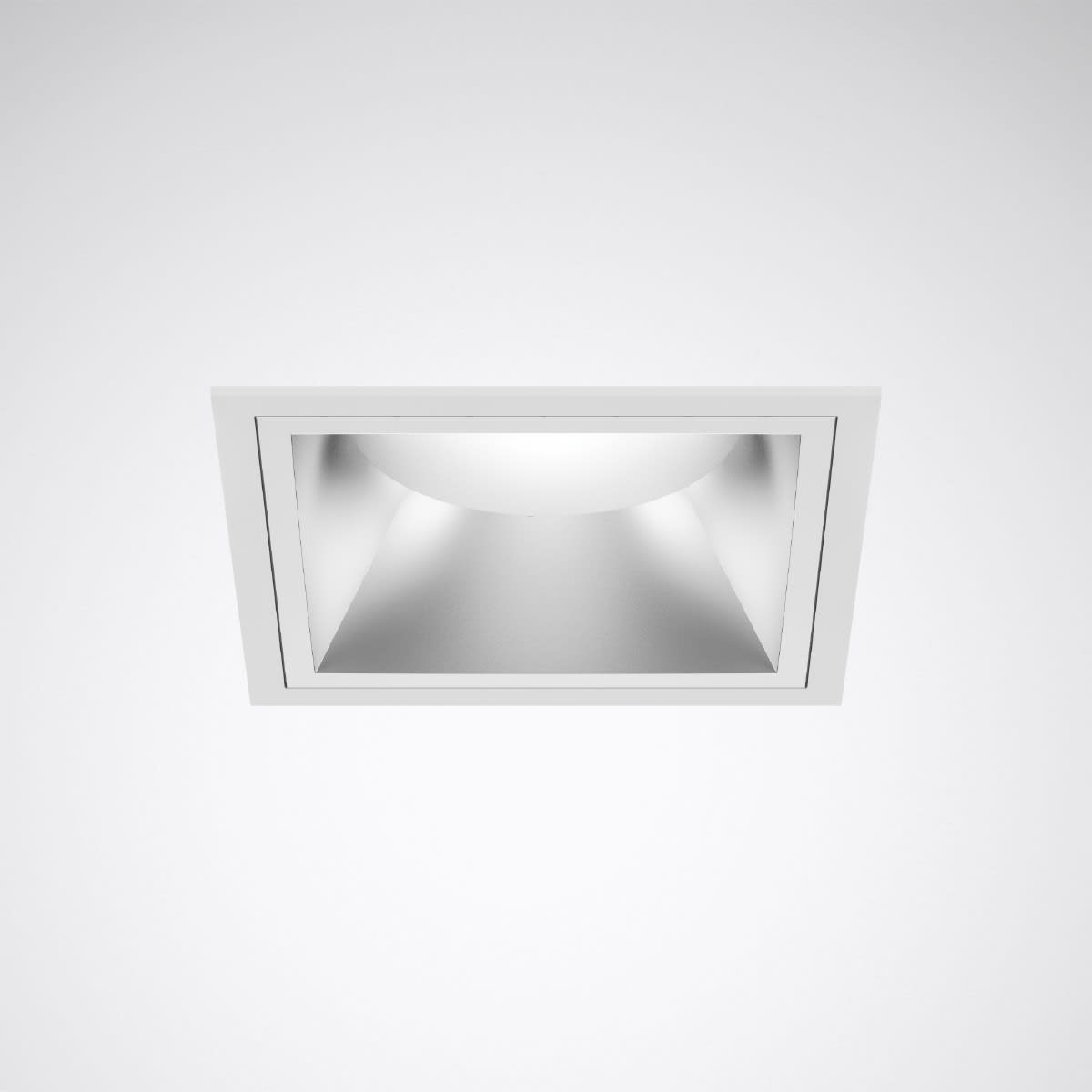 Spot encastré compact carré LED. Downlight encastré avec bord pour découpes de plafond. Convient pour une utilisation dans les entreprises certifiées HACCP, IFS et/ou BRC Global Standard Food. Découpe dans le plafond 150 mm x 150 mm, Profondeur d’encastrement > 130 mm. Avec réflecteur en plastique, métallisé, brillant mat. Le système optique avec une combinaison précisément adaptée de lentilles LED et d'éléments anti-éblouissants offre un très grand confort visuel accompagné d'une performance d'éclairage très élevée. Caractéristique du faisceau Very Wide Flood. angle d’éclairage 60°. Compatible avec les écrans informatiques selon la norme EN 12464-1 grâce à des luminosités réduites L ≤ 3 000 cd/2 pour des angles d’éclairage supérieurs à 65 °, de manière omnidirectionnelle. Guidage de la lumière via une technologie de collimateurs/lentilles. Flux lumineux du luminaire et couleur de la lumière fixes. Flux lumineux du luminaire 2000 lm, puissance raccordée 19 W - 19 W, rendement lumineux maximale du luminaire 105 lm/W. Teinte de lumière blanc neutre, température de couleur (CCT) 4000 K, indice général de rendu des couleurs (IRC) Ra > 90. Tolérance de localisation chromatique (initialement MacAdam) ≤ 3 SDCM. Durée de vie assignée moyenne L80 (tq 25 °C) = 100.000 h., Durée de vie assignée moyenne L90 (tq 25 °C) = 50.000 h. La source lumineuse est remplaçable conformément aux exigences d'écoconception (Règlement (UE) 2019/2020). Boîtier, anneau de montage et dissipateur thermique en fonte d'aluminium. Surface à revêtement blanc (similaire à RAL 9016). Dimensions extérieures de la collerette 165 mm x 165 mm. hauteur du luminaire 132.5 mm. Classe électrique (EN 61140) : II, indice de protection (norme EN 60529) : IP20, Indice de protection par le dessous : IP54, degré de résistance aux chocs selon la norme CEI 62262 : IK06, température d’essai au fil incandescent selon la norme CEI 60695-2-11 : 850 °C. Température ambiante admissible (ta): -20 °C à 25 °C. Poids: 1.3 kg. Branchement au secteur via borne enfichable avec équipement de repiquage secteur. La connexion entre le luminaire et l'appareillage est enfichable. Luminaire câblé sans halogène. Avec appareillage électronique, à gradation numérique (DALI). Appareillage conf. au standard DALI 2 (EN 62386). Possibilité de commutation et de gradation du luminaire au moyen de la fonction bouton-poussoir via les bornes de commande DALI (TouchDim). L'appareillage est remplaçable conformément aux exigences d'écoconception (Règlement (UE) 2019/2020). Ce luminaire qui est prêt au monitoring (MOR) fournit des données d’exploitation permettant une surveillance ou une maintenance prédictive, il est donc compatible avec les services de TRILUX Monitoring Services. Le produit répond aux exigences essentielles des directives européennes applicables et de la loi sur la sécurité des produits et porte le marquage CE. Le luminaire est en outre certifié ENEC par un organisme de contrôle indépendant.