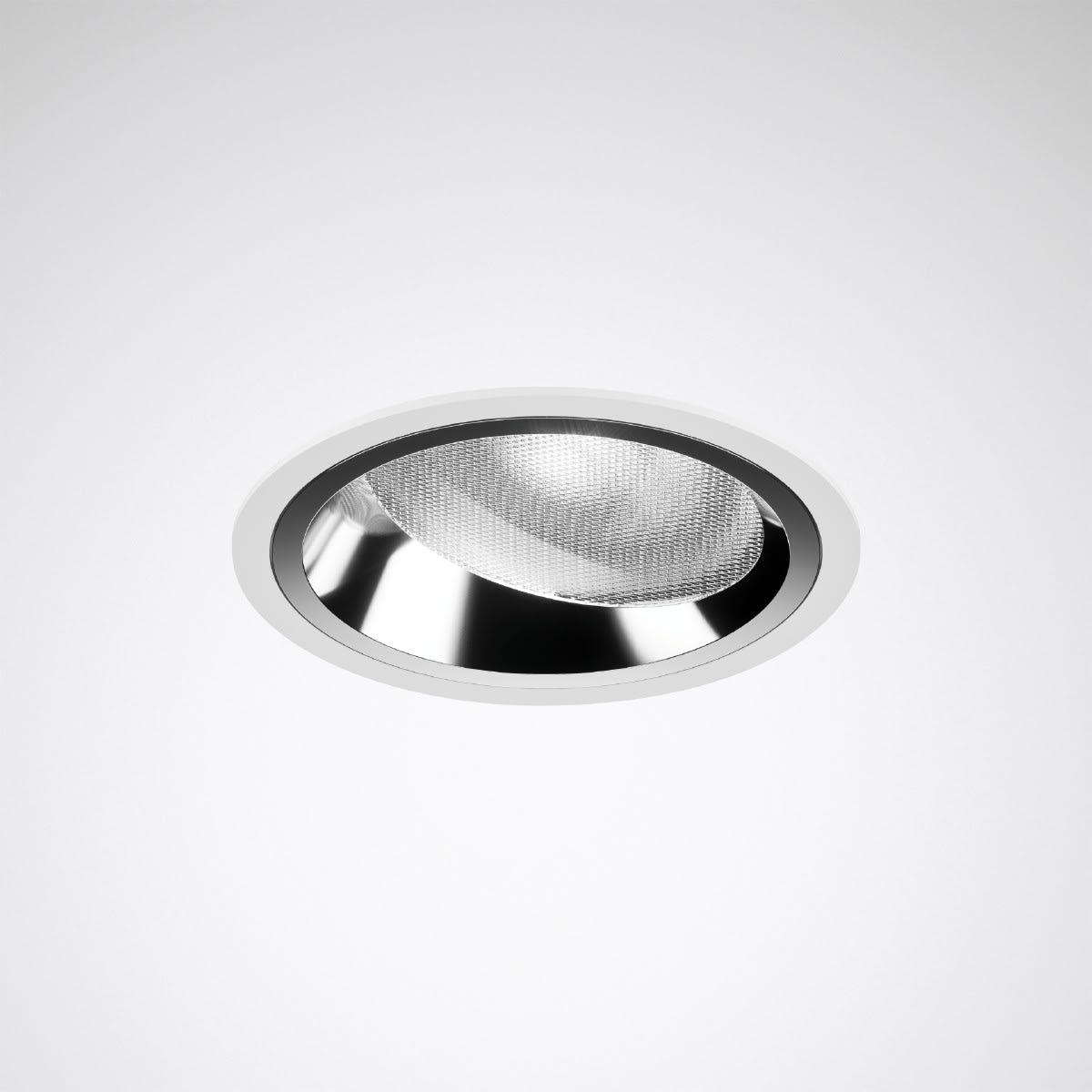 Downlight LED compact au format rond. Downlight encastré avec bord pour découpes de plafond. Convient pour une utilisation dans les entreprises certifiées HACCP, IFS et/ou BRC Global Standard Food. Découpe dans le plafond Ø 210 mm, Profondeur d’encastrement 127 mm. Des collerettes d’adaptation pour l’installation dans des découpes de plafond aux dimensions inadaptées sont disponibles en accessoires, à commander séparément. Avec réflecteur en plastique, métallisé, grand brillant. Le système optique avec une combinaison précisément adaptée de lentilles LED et d'éléments anti-éblouissants offre un très grand confort visuel accompagné d'une performance d'éclairage très élevée. Wallwasher à répartition asymétrique des intensités lumineuses. Guidage de la lumière via une technologie de collimateurs/lentilles. Flux lumineux du luminaire et couleur de la lumière fixes. Flux lumineux du luminaire 2000 lm, puissance raccordée 22 W, rendement lumineux maximale du luminaire 91 lm/W. Teinte de lumière blanc neutre, température de couleur (CCT) 4000 K, indice général de rendu des couleurs (IRC) Ra > 90. Tolérance de localisation chromatique (initialement MacAdam) ≤ 3 SDCM. Durée de vie assignée moyenne L80 (tq 25 °C) = 100.000 h., Durée de vie assignée moyenne L90 (tq 25 °C) = 50.000 h. La source lumineuse est remplaçable conformément aux exigences d'écoconception (Règlement (UE) 2019/2020). Boîtier, anneau de montage et dissipateur thermique en fonte d'aluminium. Surface à revêtement blanc (similaire à RAL 9016). Dimensions extérieures de la collerette Ø 228 mm. Classe électrique (EN 61140) : II, indice de protection (norme EN 60529) : IP20, Indice de protection par le dessous : IP44, degré de résistance aux chocs selon la norme CEI 62262 : IK06, température d’essai au fil incandescent selon la norme CEI 60695-2-11 : 850 °C. Température ambiante admissible (ta): -20 °C à 25 °C. Poids: 1.6 kg. Branchement au secteur via borne enfichable avec équipement de repiquage secteur. La connexion entre le luminaire et l'appareillage est enfichable. Luminaire câblé sans halogène. Avec appareillage électronique, à gradation numérique (DALI). Appareillage conf. au standard DALI 2 (EN 62386). Possibilité de commutation et de gradation du luminaire au moyen de la fonction bouton-poussoir via les bornes de commande DALI (TouchDim). L'appareillage est remplaçable conformément aux exigences d'écoconception (Règlement (UE) 2019/2020). Ce luminaire qui est prêt au monitoring (MOR) fournit des données d’exploitation permettant une surveillance ou une maintenance prédictive, il est donc compatible avec les services de TRILUX Monitoring Services. Le produit répond aux exigences essentielles des directives européennes applicables et de la loi sur la sécurité des produits et porte le marquage CE. Le luminaire est en outre certifié ENEC par un organisme de contrôle indépendant.