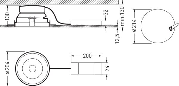 Downlight LED compact au format rond. Convient pour une utilisation dans les entreprises certifiées HACCP, IFS et/ou BRC Global Standard Food. Découpe dans le plafond Ø 214 mm, Profondeur d’encastrement 130 mm. Avec réflecteur en plastique, métallisé, grand brillant. Le système optique avec une combinaison précisément adaptée de lentilles LED et d'éléments anti-éblouissants offre un très grand confort visuel accompagné d'une performance d'éclairage très élevée. Caractéristique du faisceau Very Wide Flood. angle d’éclairage 59°. Compatible avec les écrans informatiques selon la norme EN 12464-1 grâce à des luminosités réduites L ≤ 3 000 cd/2 pour des angles d’éclairage supérieurs à 65 °, de manière omnidirectionnelle. Guidage de la lumière via une technologie de collimateurs/lentilles. Flux lumineux du luminaire et couleur de la lumière fixes. Flux lumineux du luminaire 3700 lm, puissance raccordée 36 W, rendement lumineux maximale du luminaire 103 lm/W. Teinte de lumière blanc chaud, température de couleur (CCT) 3000 K, indice général de rendu des couleurs (IRC) Ra > 90. Tolérance de localisation chromatique (initialement MacAdam) ≤ 3 SDCM. Durée de vie assignée moyenne L80 (tq 25 °C) = 100.000 h., Durée de vie assignée moyenne L90 (tq 25 °C) = 50.000 h. La source lumineuse est remplaçable conformément aux exigences d'écoconception (Règlement (UE) 2019/2020). Boîtier et corps de refroidissement en aluminium moulé sous pression. Surface à revêtement blanc (similaire à RAL 9016). Diamètre du luminaire Ø 204 mm, hauteur du luminaire 130 mm Classe électrique (EN 61140) : II, indice de protection (norme EN 60529) : IP20, Indice de protection par le dessous : IP54, degré de résistance aux chocs selon la norme CEI 62262 : IK06, température d’essai au fil incandescent selon la norme CEI 60695-2-11 : 850 °C. Température ambiante admissible (ta): -20 °C à 25 °C. Poids: 1.6 kg. Branchement au secteur via borne enfichable avec équipement de repiquage secteur. La connexion entre le luminaire et l'appareillage est enfichable. Luminaire câblé sans halogène. Avec appareillage électronique, à gradation numérique (DALI). Appareillage conf. au standard DALI 2 (EN 62386). Possibilité de commutation et de gradation du luminaire au moyen de la fonction bouton-poussoir via les bornes de commande DALI (TouchDim). L'appareillage est remplaçable conformément aux exigences d'écoconception (Règlement (UE) 2019/2020). Le produit répond aux exigences essentielles des directives européennes applicables et de la loi sur la sécurité des produits et porte le marquage CE. Le luminaire est en outre certifié ENEC par un organisme de contrôle indépendant.
