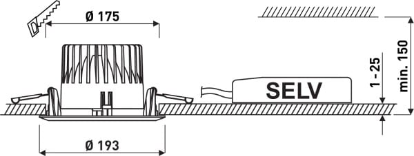 Downlight LED rond avec réflecteur en aluminium à facettes. Système optique doté d’un réflecteur à facettes 3D. Caractéristique du faisceau Flood. angle d’éclairage 39°. Flux lumineux du luminaire et couleur de la lumière fixes. Flux lumineux du système 7480 lm, Puissance du système 54 W, Teinte de lumière blanc neutre, température de couleur (CCT) 4000 K, indice général de rendu des couleurs (IRC) Ra > 80. Durée de vie assignée moyenne L80 (tq 25 °C) = 50.000 h. Corps de luminaire en aluminium moulé sous pression. hauteur: 117 mm, Diamètre extérieur: 193 mm. Classe électrique (EN 61140) : II, indice de protection (norme EN 60529) : IP20. Température ambiante admissible (ta): 25 °C Poids: 0.9 kg. Câble d’alimentation avec adaptateur pour système de connecteur rapide GST 18i3 de type Wieland. La tension de service nominale du luminaire est de : 230 V, 50/60 Hz. Avec appareillage électronique, commutable. L'appareillage est remplaçable conformément aux exigences d'écoconception (Règlement (UE) 2019/2020). Le produit répond aux exigences essentielles des directives européennes applicables et de la loi sur la sécurité des produits et porte le marquage CE.