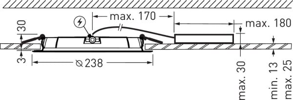 Downlight LED pour les plafonds avec une dimension de cavité ≥ 50 mm. Découpe dans le plafond Ø 210 mm, Profondeur d’encastrement 75 mm. Avec plaque de recouvrement en PMMA opale. Avec une répartition lambertienne des intensités lumineuses. angle d’éclairage 113°. Flux lumineux du luminaire et couleur de la lumière fixes. Flux lumineux du luminaire 2000 lm, puissance raccordée 20,00 W, Teinte de lumière blanc neutre, température de couleur (CCT) 4000 K, indice général de rendu des couleurs (IRC) Ra > 80. Tolérance de localisation chromatique (initialement MacAdam) ≤ 5 SDCM. Corps du luminaire en PC. Collerette, laquage par poudre, blanc (similaire à RAL 9016). Dimensions extérieures de la collerette Ø 238 mm, hauteur du luminaire 33 mm. Classe électrique (EN 61140) : II, indice de protection (norme EN 60529) : IP20, degré de résistance aux chocs selon la norme CEI 62262 : IK02, température d’essai au fil incandescent selon la norme CEI 60695-2-11 : 650 °C. Température ambiante admissible (ta): 25 °C Poids: 0.5 kg. Avec driver, dimmable (DALI). Appareillage conf. au standard DALI 2 (EN 62386). Possibilité de commutation et de gradation du luminaire au moyen de la fonction bouton-poussoir via les bornes de commande DALI (TouchDim). Le produit répond aux exigences essentielles des directives européennes applicables et de la loi sur la sécurité des produits et porte le marquage CE.