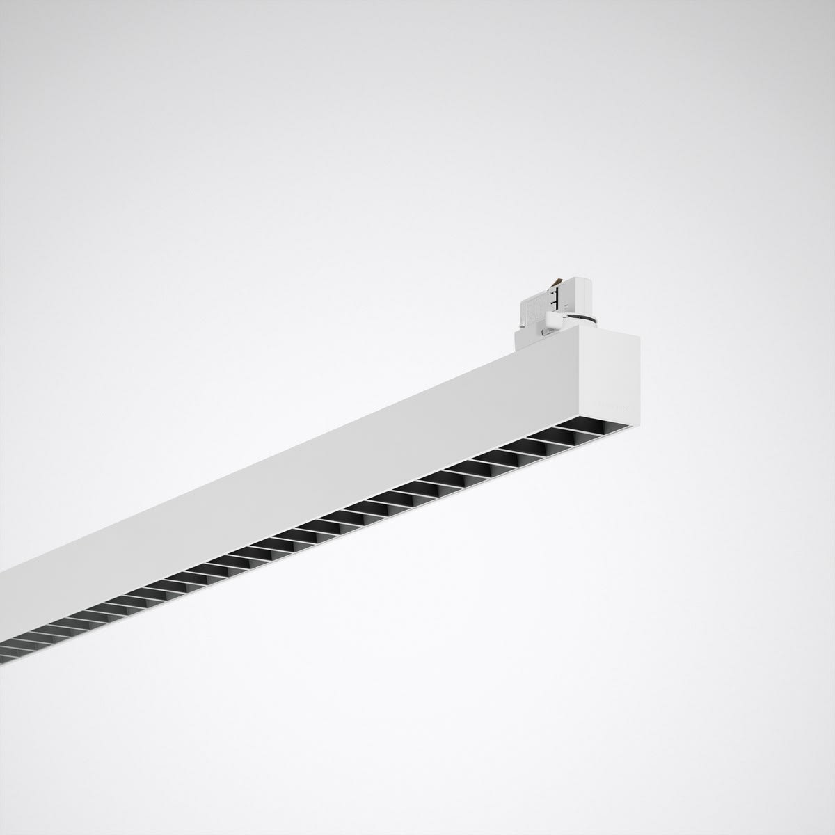 Luminaire individuel pour canal d'éclairage pour rail conducteur triphasé, Rail. Système Rail (Stucchi). Le système optique avec une combinaison précisément adaptée de lentilles LED et d'éléments anti-éblouissants offre un très grand confort visuel accompagné d'une performance d'éclairage très élevée. Cubes anti-éblouissement, en noir, à surface finement structurée. À répartition symétrique limitée et extensive des intensités lumineuses. Taux d'éblouissement selon classification UGR (EN 12464-1) < 19. Compatible avec les postes de travail informatisés selon la norme EN 124641. Flux lumineux du luminaire et couleur de la lumière fixes. Flux lumineux du luminaire 2955 lm, puissance raccordée 33 W, rendement lumineux maximale du luminaire 90 lm/W. Teinte de lumière blanc chaud, température de couleur (CCT) 3000 K, indice général de rendu des couleurs (IRC) Ra > 80. Tolérance de localisation chromatique (initialement MacAdam) ≤ 4 SDCM. Durée de vie assignée moyenne L90 (tq 25 °C) = 50.000 h., Durée de vie assignée moyenne L80 (tq 25 °C) = 100.000 h. La source lumineuse est remplaçable conformément aux exigences d'écoconception (Règlement (UE) 2019/2020). Corps de luminaire en profilé d’aluminium extrudé. Surface à revêtement blanc (similaire à RAL 9016). Dimensions (L x l): 1056 mm x 50 mm, hauteur du luminaire 62 mm. Classe électrique (EN 61140) : I, indice de protection (norme EN 60529) : IP20, degré de résistance aux chocs selon la norme CEI 62262 : IK03, température d’essai au fil incandescent selon la norme CEI 60695-2-11 : 650 °C. Température ambiante admissible (ta): 25 °C . Poids: 5.2 kg. Avec appareillage électronique, à gradation numérique (DALI) Appareillage conf. au standard DALI 2 (EN 62386). L'appareillage est remplaçable conformément aux exigences d'écoconception (Règlement (UE) 2019/2020). Le produit répond aux exigences essentielles des directives européennes applicables et de la loi sur la sécurité des produits et porte le marquage CE.