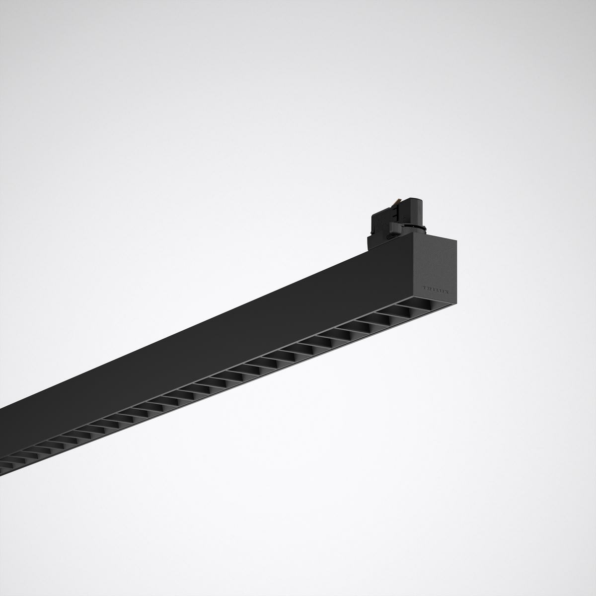 Luminaire individuel pour canal d'éclairage pour rail conducteur triphasé, Rail. Système Rail (Stucchi). Le système optique avec une combinaison précisément adaptée de lentilles LED et d'éléments anti-éblouissants offre un très grand confort visuel accompagné d'une performance d'éclairage très élevée. Cubes anti-éblouissement, en noir, à surface finement structurée. À répartition symétrique limitée et extensive des intensités lumineuses. Taux d'éblouissement selon classification UGR (EN 12464-1) < 19. Compatible avec les postes de travail informatisés selon la norme EN 124641. Flux lumineux du luminaire et couleur de la lumière fixes. Flux lumineux du luminaire 2955 lm, puissance raccordée 33 W, rendement lumineux maximale du luminaire 90 lm/W. Teinte de lumière blanc chaud, température de couleur (CCT) 3000 K, indice général de rendu des couleurs (IRC) Ra > 80. Tolérance de localisation chromatique (initialement MacAdam) ≤ 4 SDCM. Durée de vie assignée moyenne L90 (tq 25 °C) = 50.000 h., Durée de vie assignée moyenne L80 (tq 25 °C) = 100.000 h. La source lumineuse est remplaçable conformément aux exigences d'écoconception (Règlement (UE) 2019/2020). Corps de luminaire en profilé d’aluminium extrudé. Surface à revêtement noir (similaire à RAL 9005). Dimensions (L x l): 1056 mm x 50 mm, hauteur du luminaire 62 mm. Classe électrique (EN 61140) : I, indice de protection (norme EN 60529) : IP20, degré de résistance aux chocs selon la norme CEI 62262 : IK03, température d’essai au fil incandescent selon la norme CEI 60695-2-11 : 650 °C. Température ambiante admissible (ta): 25 °C . Poids: 5.2 kg. Avec appareillage électronique, à gradation numérique (DALI) Appareillage conf. au standard DALI 2 (EN 62386). L'appareillage est remplaçable conformément aux exigences d'écoconception (Règlement (UE) 2019/2020). Le produit répond aux exigences essentielles des directives européennes applicables et de la loi sur la sécurité des produits et porte le marquage CE.