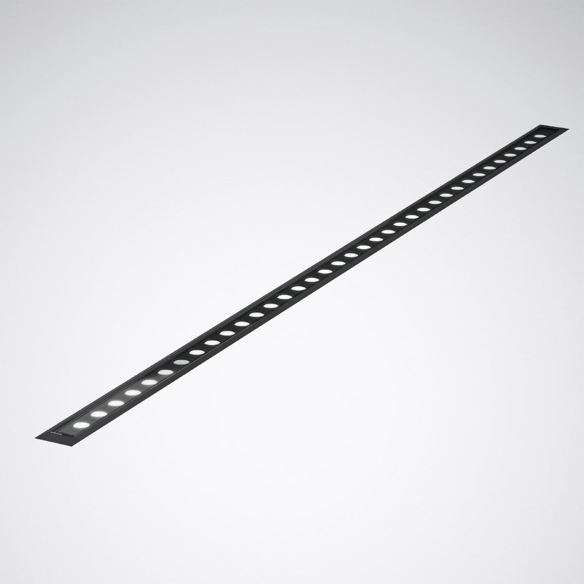 Luminaire LED décoratif à encastrer dans le sol pour des applications d’éclairage d’accentuation. Il est possible de marcher sur le luminaire. Le client doit prévoir des fondations correspondantes à la charge avec un drainage suffisant. À répartition à symétrie en rotation profonde des intensités lumineuses. Avec verre de fermeture, clair. Flux lumineux du luminaire et couleur de la lumière fixes. Flux lumineux du luminaire 4000 lm, puissance raccordée 36 W, rendement lumineux maximale du luminaire 111 lm/W. Teinte de lumière blanc chaud, température de couleur (CCT) 3000 K, indice général de rendu des couleurs (IRC) Ra > 80. Tolérance de localisation chromatique (initialement MacAdam) ≤ 5 SDCM. Durée de vie assignée moyenne L80 (tq 25 °C) = 50.000 h. Corps de luminaire en profilé d’aluminium extrudé et en éléments de fonte d’aluminium. Avec verre de fermeture en affleurement et unité LED intégrée. Couleur anthracite (similaire à DB 703). Boîtier de luminaire très résistant aux intempéries, revêtement poudré. Dimensions (L x l): 1220 mm x 43 mm, hauteur du luminaire 32 mm. Classe électrique (EN 61140) : III, indice de protection (norme EN 60529) : IP67, degré de résistance aux chocs selon la norme CEI 62262 : IK05. Température ambiante admissible (ta): 25 °C Poids: 2.0 kg. Le raccordement électrique à l’appareillage séparé s’effectue grâce au câble d’alimentation sortant vers l’extérieur (2000 mm). Luminaire sans appareillage. Appareillage externe à commander séparément sous forme d’accessoires. Résistance aux pics de tension Mode différentiel / mode commun : / . Le produit répond aux exigences essentielles des directives européennes applicables et de la loi sur la sécurité des produits et porte le marquage CE.