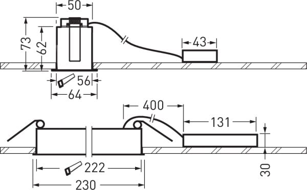 Luminaire individuel du système de canaux lumineux pour une mise en scène architecturale de l’éclairage. Ce luminaire fait partie d’une gamme de luminaires encastrés, de plafonniers et de luminaires suspendus, dont l’aspect est harmonisé. Tous les accessoires indispensables au système (étriers de montage/étriers pivotants et embouts frontaux) sont inclus dans la livraison. Pour des informations détaillées sur les dimensions de montage, nous vous renvoyons aux dernières instructions de montage. Le système optique avec une combinaison précisément adaptée de lentilles LED et d'éléments anti-éblouissants offre un très grand confort visuel accompagné d'une performance d'éclairage très élevée. À répartition symétrique limitée et extensive des intensités lumineuses. Taux d'éblouissement selon classification UGR (EN 12464-1) < 16. Cubes anti-éblouissement, en blanc, à surface finement structurée. Flux lumineux du luminaire et couleur de la lumière fixes. Flux lumineux du luminaire 580 lm, puissance raccordée 7 W, rendement lumineux maximale du luminaire 83 lm/W. Teinte de lumière blanc chaud, température de couleur (CCT) 3000 K, indice général de rendu des couleurs (IRC) Ra > 80. Tolérance de localisation chromatique (initialement MacAdam) ≤ 4 SDCM. Durée de vie assignée moyenne L90 (tq 25 °C) = 50.000 h., Durée de vie assignée moyenne L80 (tq 25 °C) = 100.000 h. La source lumineuse est remplaçable conformément aux exigences d'écoconception (Règlement (UE) 2019/2020). Éléments de canal en profilé extrudé d’aluminium, embouts frontaux en plastique (PMMA). Surface à revêtement blanc (similaire à RAL 9016). Dimensions (L x l): 230 mm x 64 mm, hauteur du luminaire 62 mm. Classe électrique (EN 61140) : II, indice de protection (norme EN 60529) : IP20, degré de résistance aux chocs selon la norme CEI 62262 : IK03, température d’essai au fil incandescent selon la norme CEI 60695-2-11 : 650 °C. Température ambiante admissible (ta): 25 °C . Poids: 0.9 kg. Le raccordement au réseau s'effectue au moyen d'une borne à 5 pôles jusqu'à 1,5 mm2. Avec driver, dimmable (DALI). Appareillage conf. au standard DALI 2 (EN 62386). L'appareillage est remplaçable conformément aux exigences d'écoconception (Règlement (UE) 2019/2020). Ce luminaire qui est prêt au monitoring (MOR) fournit des données d’exploitation permettant une surveillance ou une maintenance prédictive, il est donc compatible avec les services de TRILUX Monitoring Services. Le produit répond aux exigences essentielles des directives européennes applicables et de la loi sur la sécurité des produits et porte le marquage CE.