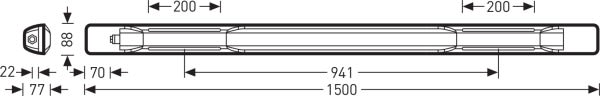 Plafonnier étanche LED IP66. Avantageux en cas d'exigences élevées en matière de stabilité mécanique. Satisfaisant à la norme DIN 10500. Les luminaires conviennent à des applications dans des entreprises de l’industrie alimentaire et des boissons, certifiées pour HACCP versions IFS 6 et/ou BRC 7 (Global Standard Food). Luminaire ayant une température de surface limitée et convenant à une utilisation dans des locaux à risque d’incendie conformément à la norme DIN EN 60598-2-24. Pour montage au mur et au plafond ainsi que pour montage suspendu. Montage suspendu possible avec accessoires optionnels. Montage par crampons de fixation en acier inoxydable joints. Diffuseur en PC avec structure de prismes situé à l'intérieur. À répartition symétrique extensive des intensités lumineuses. Évaluation de l’éblouissement (EN 12464-1) selon UGR < 25. Flux lumineux du luminaire 5600 lm, puissance raccordée 53,00 W, rendement lumineux du luminaire 105 lm/W. Teinte de lumière blanc neutre, température de couleur (CCT) 4000 K, Tolérance de localisation chromatique (initialement MacAdam) ≤ 3 SDCM, indice général de rendu des couleurs (IRC) Ra > 80. Durée de vie assignée moyenne L80(tq 25 °C) = 35.000 h, Durée de vie assignée moyenne L70(tq 25 °C) = 50.000 h. Corps de luminaire en polyester renforcé par fibres de verre. Gris lumière (RAL 7035). Dimensions (L x l): 1500 mm x 88 mm, hauteur du luminaire 77 mm. Température ambiante admissible (ta): -20 °C - +35 °C. Classe électrique (EN 61140) : I, indice de protection (norme EN 60529) : IP66, degré de résistance aux chocs selon la norme CEI 62262 : IK08, température d’essai au fil incandescent selon la norme CEI 60695-2-11 : 850 °C. Luminaire pour montage rapide à système de connecteur rapide ADELS LC75/3. Prise de raccordement sur une extrémité de la tête. Avec driver. Ce luminaire qui satisfait à toutes les exigences essentielles des directives européennes applicables et de la loi sur la sécurité des produits (LSPro) porte le marquage CE.