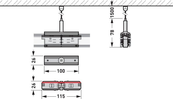 Kit de connexion composé d’un étrier et d’un accouplement conducteur sans dispositif d’alimentation pour une connexion mécanique et électrique intégrée. Kit de suspension par câble composé d’un câble en acier galvanisé, Ø 1,5 mm, crampon de fixation et douille décorative en en acier inoxydable. À utiliser en combinaison avec système de rails conducteurs triphasé (DALI) - Rail.. Convient aux rails conducteurs en saillie. Couleur noir (similaire à RAL 9005). Dimensions (L x l x H) : 120 mm x 32 mm x 90 mm. Position de la polarité, voir le marquage rouge sur le schéma coté.
