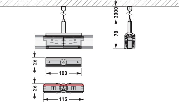 Kit de connexion composé d’un étrier et d’un accouplement conducteur sans dispositif d’alimentation pour une connexion mécanique et électrique intégrée. Kit de suspension par câble composé d’un câble en acier galvanisé, Ø 1,5 mm, crampon de fixation et douille décorative en en acier inoxydable. À utiliser en combinaison avec système de rails conducteurs triphasé (DALI) - Rail.. Convient aux rails conducteurs en saillie. Couleur noir (similaire à RAL 9005). Dimensions (L x l x H) : 120 mm x 32 mm x 90 mm. Position de la polarité, voir le marquage rouge sur le schéma coté.