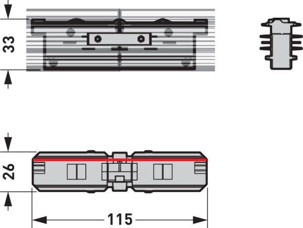 Kit de crépissage pour un encastrement au plafond sans rebord. Accouplement conducteur sans dispositif d’alimentation pour une connexion mécanique et électrique intégrée. À utiliser en combinaison avec système de rails conducteurs triphasé (DALI) - Rail.. Couleur noir (similaire à RAL 9005). Dimensions (L x l x H) : 115 mm x 30 mm x 33 mm. Position de la polarité, voir le marquage rouge sur le schéma coté.