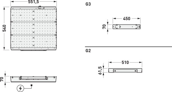 Kit LED pour la rénovation des luminaires existants restant dans ou sur le plafond. Kit LED pour la série Fidesca-SD G2... . La lampada tradizionale e l'alimentatore precedente vengono rimossi e sostituiti dal kit LED. Le corps du luminaire reste sur le lieu d'installation, l'ancien système optique (diffuseur) fermant la pièce est toujours utilisé . Le flux lumineux du système du luminaire existant rénové dépend des effets du vieillissement du système optique installé ainsi que du degré d'encrassement. Le commutateur DIP permet de régler les flux lumineux du système de manière analogue aux types de lampes utilisés dans l'ancien système. Flux lumineux du luminaire réglable sur 3 niveaux (Multilumen). Flux lumineux du luminaire 3500 lm - 6500 lm, puissance raccordée 30 W - 54 W, rendement lumineux maximale du luminaire 120 lm/W. Teinte de lumière blanc neutre, température de couleur (CCT) 4000 K, indice général de rendu des couleurs (IRC) Ra > 90. Tolérance de localisation chromatique (initialement MacAdam) ≤ 3 SDCM. Durée de vie assignée moyenne L70 (tq 25 °C) = 100.000 h., Durée de vie assignée moyenne L80 (tq 25 °C) = 100.000 h. La source lumineuse est remplaçable conformément aux exigences d'écoconception (Règlement (UE) 2019/2020). Corps de luminaire en aluminium, Revêtement poudre. Couleur blanc (similaire à RAL 9016). Dimensions (L x l x H) : 552 mm x 521 mm x 70 mm. Classe électrique (EN 61140) : I, indice de protection (norme EN 60529) : IP20, degré de résistance aux chocs selon la norme CEI 62262 : , température d’essai au fil incandescent selon la norme CEI 60695-2-11 : 850 °C. Température ambiante admissible (ta): 25 °C Poids: 3.8 kg. Avec appareillage électronique, à gradation numérique (DALI). L'appareillage est remplaçable conformément aux exigences d'écoconception (Règlement (UE) 2019/2020). Le produit répond aux exigences essentielles des directives européennes applicables et de la loi sur la sécurité des produits et porte le marquage CE.
