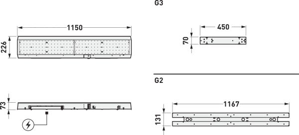 Kit LED pour la rénovation des luminaires existants restant dans ou sur le plafond. Kit LED pour la série Fidesca-SD G3... . La lampada tradizionale e l'alimentatore precedente vengono rimossi e sostituiti dal kit LED. Le corps du luminaire reste sur le lieu d'installation, l'ancien système optique (diffuseur) fermant la pièce est toujours utilisé . Le flux lumineux du système du luminaire existant rénové dépend des effets du vieillissement du système optique installé ainsi que du degré d'encrassement. Le commutateur DIP permet de régler les flux lumineux du système de manière analogue aux types de lampes utilisés dans l'ancien système. Flux lumineux du luminaire réglable sur 4 niveaux (Multilumen). Flux lumineux du luminaire 4500 lm - 8200 lm, puissance raccordée 36 W - 65 W, rendement lumineux maximale du luminaire 126 lm/W. Teinte de lumière blanc neutre, température de couleur (CCT) 4000 K, indice général de rendu des couleurs (IRC) Ra > 90. Tolérance de localisation chromatique (initialement MacAdam) ≤ 3 SDCM. Durée de vie assignée moyenne L70 (tq 25 °C) = 100.000 h., Durée de vie assignée moyenne L80 (tq 25 °C) = 100.000 h. La source lumineuse est remplaçable conformément aux exigences d'écoconception (Règlement (UE) 2019/2020). Corps de luminaire en aluminium, Revêtement poudre. Couleur blanc (similaire à RAL 9016). Dimensions (L x l x H) : 1150 mm x 221 mm x 70 mm. Classe électrique (EN 61140) : I, indice de protection (norme EN 60529) : IP20, degré de résistance aux chocs selon la norme CEI 62262 : , température d’essai au fil incandescent selon la norme CEI 60695-2-11 : 850 °C. Température ambiante admissible (ta): 25 °C Poids: 3.3 kg. Avec appareillage électronique, à gradation numérique (DALI). Appareillage conf. au standard DALI 2 (EN 62386). Possibilité de commutation et de gradation du luminaire au moyen de la fonction bouton-poussoir via les bornes de commande DALI (TouchDim). L'appareillage est remplaçable conformément aux exigences d'écoconception (Règlement (UE) 2019/2020). Le produit répond aux exigences essentielles des directives européennes applicables et de la loi sur la sécurité des produits et porte le marquage CE.