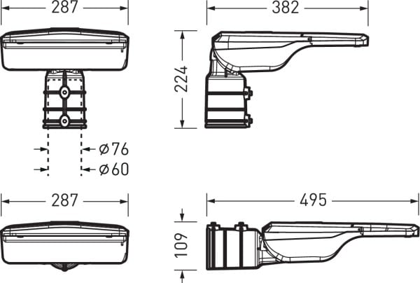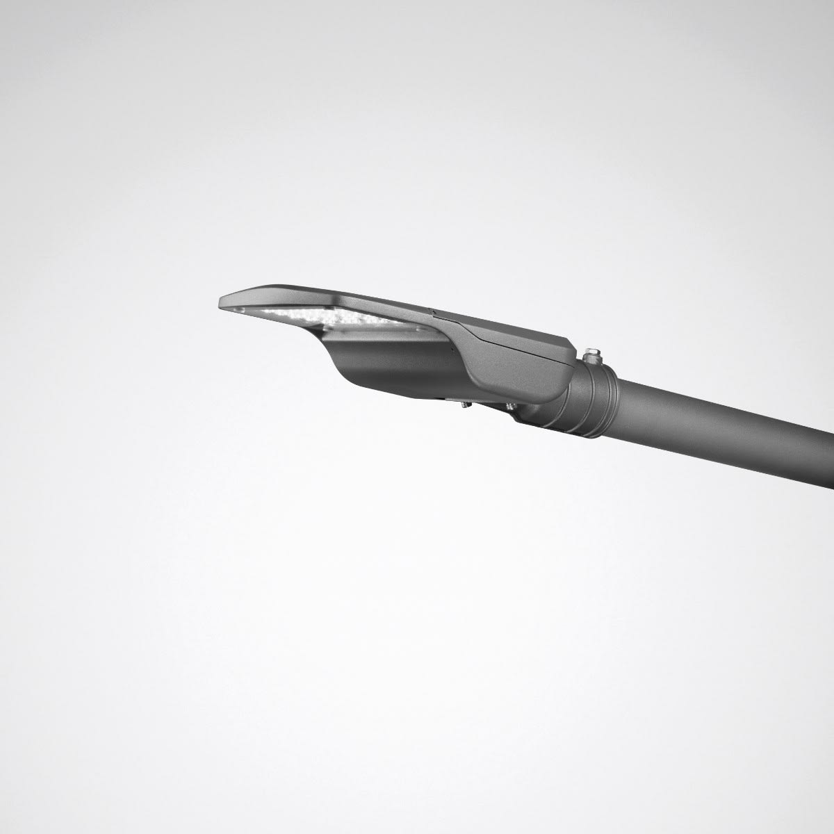 luminaire extérieur sur mât pour un montage droit et un montage pour crosse, angle d'inclinaison réglable. Pour un montage droit et un montage pour crosse pour la tête du mât de Ø 60 mm ou Ø 76 mm. Angle d'inclinaison en 5 paliers de +/- 10 ° réglable, à l'échelle. Système optique composé d’une optique à lentilles PMMA. Recouvrement de l’ouverture de sortie de lumière en verre de sécurité simple, clair. À répartition asymétrique extensive des intensités lumineuses. Flux lumineux du luminaire réglable sur 3 niveaux. Flux lumineux du luminaire 1800 lm - 7500 lm, puissance raccordée 13 W - 60 W, rendement lumineux maximale du luminaire 138 lm/W. Teinte de lumière blanc neutre, température de couleur (CCT) 4000 K, indice général de rendu des couleurs (IRC) Ra > 70. Tolérance de localisation chromatique (initialement MacAdam) ≤ 5 SDCM. Durée de vie assignée moyenne L80(tq 25 °C) = 75.000 h. Corps de luminaire en aluminium Surface revêtue d'anthracite (DB 703). Classe électrique (EN 61140) : II, indice de protection (norme EN 60529) : IP66, degré de résistance aux chocs selon la norme CEI 62262 : IK08. Mât disponible sur demande. Surface exposée au vent Fw 0.110 m2. Poids: 4.5 kg. Avec driver. L'appareillage est remplaçable conformément aux exigences d'écoconception (Règlement (UE) 2019/2020). Résistance aux pics de tension Mode différentiel / mode commun : 6 kV / 10 kV. Le produit répond aux exigences essentielles des directives européennes applicables et de la loi sur la sécurité des produits et porte le marquage CE.