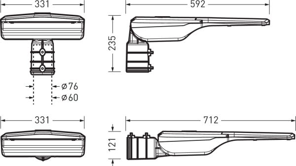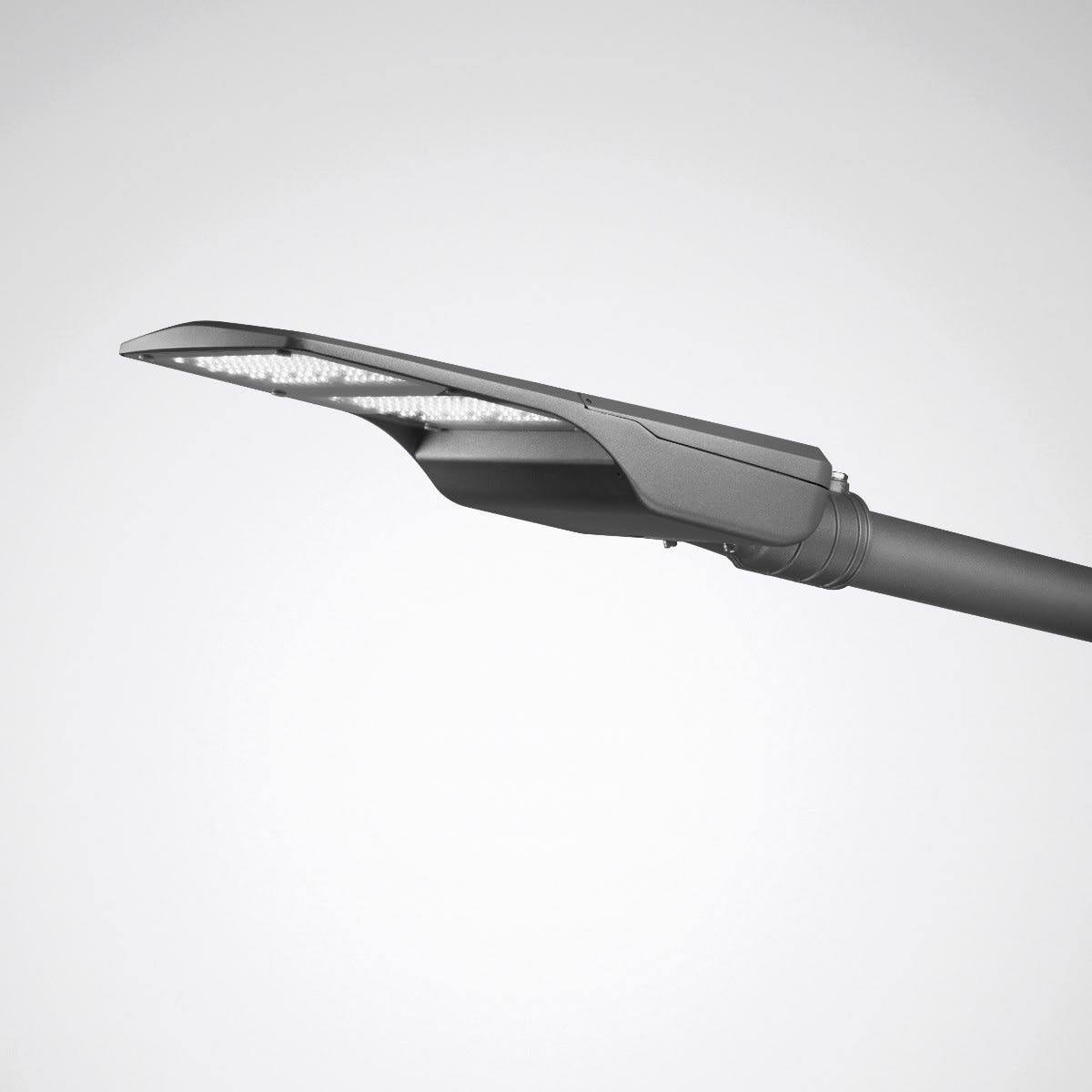 luminaire extérieur sur mât pour un montage droit et un montage pour crosse, angle d'inclinaison réglable. Pour un montage droit et un montage pour crosse pour la tête du mât de Ø 60 mm ou Ø 76 mm. Angle d'inclinaison en 5 paliers de +/- 10 ° réglable, à l'échelle. Système optique composé d’une optique à lentilles PMMA. Recouvrement de l’ouverture de sortie de lumière en verre de sécurité simple, clair. À répartition asymétrique extensive des intensités lumineuses. Flux lumineux du luminaire réglable sur 3 niveaux. Flux lumineux du luminaire 10000 lm - 20000 lm, puissance raccordée 73 W - 165 W, rendement lumineux maximale du luminaire 137 lm/W. Teinte de lumière blanc neutre, température de couleur (CCT) 4000 K, indice général de rendu des couleurs (IRC) Ra > 70. Tolérance de localisation chromatique (initialement MacAdam) ≤ 5 SDCM. Durée de vie assignée moyenne L80(tq 25 °C) = 75.000 h. Corps de luminaire en aluminium Surface revêtue d'anthracite (DB 703). Classe électrique (EN 61140) : II, indice de protection (norme EN 60529) : IP66, degré de résistance aux chocs selon la norme CEI 62262 : IK08. Mât disponible sur demande. Surface exposée au vent Fw 0.200 m2. Poids: 8.1 kg. Avec driver. L'appareillage est remplaçable conformément aux exigences d'écoconception (Règlement (UE) 2019/2020). Résistance aux pics de tension Mode différentiel / mode commun : 6 kV / 10 kV. Le produit répond aux exigences essentielles des directives européennes applicables et de la loi sur la sécurité des produits et porte le marquage CE.
