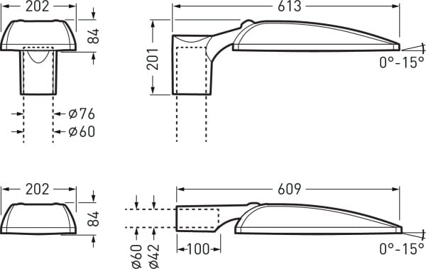 Luminaire extérieur pour mât droit, polyvalent, au design réduit international et de format plat. Avec réduction de la puissance autonome via la phase de commande. L'inclinaison de la tête du luminaire est réglable. Angle d’inclinaison pour montage sur crosse, réglable o°, -5°, -10°, -15°. Angle d’inclinaison pour montage droit 0°, 5°, 10°, 15°. En version MLT (Technologie Multi Lens), composé de systèmes de lentilles hautement efficaces, résistants aux UV et aux températures extrêmes, en montage quadruple. À répartition semi-extensive asymétrique des intensités lumineuses. Pour l’éclairage de parkings, de surfaces de stockage et similaire. Flux lumineux du luminaire et couleur de lumière fixes, avec maintien du flux lumineux en fin de vie (CLO). Flux lumineux du luminaire 6800 lm, puissance raccordée 54 W, rendement lumineux maximale du luminaire 126 lm/W. Teinte de lumière blanc chaud, température de couleur (CCT) 3000 K, Disponible sur demande également en version Tunable White (2200 K – 4000 K). indice général de rendu des couleurs (IRC) Ra > 70. Tolérance de localisation chromatique (initialement MacAdam) ≤ 5 SDCM. Autres couleurs de lumière LED disponibles sur demande. Durée de vie assignée moyenne LCLO (tq 25 °C) = 100.000 h. La source lumineuse est remplaçable conformément aux exigences d'écoconception (Règlement (UE) 2019/2020). Corps de luminaire en aluminium moulé sous pression. Surface à revêtement anthracite (similaire à DB 703). Boîtier de luminaire très résistant aux intempéries, revêtement poudré. Revêtement convenant à un climat maritime, sur demande. Avec lentille de recouvrement en PMMA, imprimée. Le client peut opter pour une impression personnalisée de la vitre de fermeture. Sur demande : plaque visible derrière la vitre de fermeture, protégée contre les intempéries. Mât disponible sur demande. Classe électrique (EN 61140) : II, indice de protection (norme EN 60529) : IP66, degré de résistance aux chocs selon la norme CEI 62262 : IK09. Température ambiante admissible (ta): 25 °C Surface exposée au vent Fw 0.100 m2. Poids: 4.5 kg. Le raccordement du luminaire s’effectue sans ouvrir son corps grâce au câble d’alimentation sortant vers l’extérieur. Longueur du câble d’alimentation: 8,0 m. Câble d’alimentation résistant aux UV pour le montage en extérieur sur des traverses. Avec driver. L'appareillage est remplaçable conformément aux exigences d'écoconception (Règlement (UE) 2019/2020). Résistance aux pics de tension Mode différentiel / mode commun : 6 kV / 10 kV. Le produit répond aux exigences essentielles des directives européennes applicables et de la loi sur la sécurité des produits et porte le marquage CE. Le luminaire est en outre certifié ENEC par un organisme de contrôle indépendant.