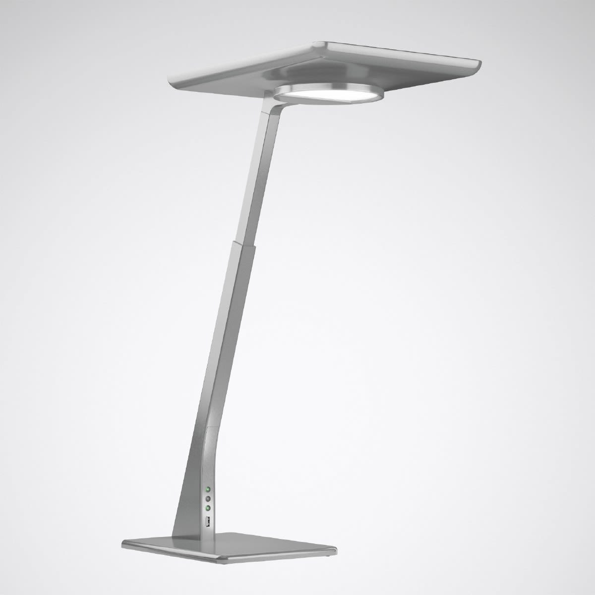 Luminaire de bureau innovant à composante directe pour l’éclairage individuel des postes de travail et à composante indirecte pour l’éclairage intérieur général. À gestion d’éclairage intégré pour la commande synchrone de la température de couleur en fonction de l’heure et de la saison (commande circadienne) aux deux niveaux de sortie de lumière. La fonction Smart Connect intégrée permet de regrouper 20 luminaires au maximum en un groupe et de les piloter. La fonction d’éclairage se commande manuellement via 3 éléments de commande ainsi que via l’application smartphone. Avec équipement Smart-Connect. Système anti-éblouissement triple (TGCS®) pour une composante indirecte à éblouissement réduit, à répartition symétrique et au faisceau d’éclairage limité. À vitre de fermeture en verre acrylique clair, très résistant aux rayures. À répartition symétrique limitée et extensive des intensités lumineuses. Taux d'éblouissement selon classification UGR (EN 12464-1) < 19. Avec équipement HCL pour la commande de la couleur de la lumière au moyen d'un appareil de commande séparé (DT8). Flux lumineux du luminaire 5580 lm, puissance raccordée 56 W, rendement lumineux maximale du luminaire 107 lm/W. Répartition du flux lumineux du luminaire, composante indirecte/directe 90% / 10 %. Teinte de lumière variable (blanc chaud - blanc lumière du jour), température de couleur (CCT) variable (2 700 K - 6 000 K), indice général de rendu des couleurs (IRC) Ra > 80. Tolérance de localisation chromatique (initialement MacAdam) ≤ 3 SDCM. Durée de vie assignée moyenne L80(tq 25 °C) = 50.000 h. Corps de luminaire en aluminium moulé sous pression. Surface revêtue de gris argenté (RAL 9006). Éléments de commande chromés. Dimensions de la tête de luminaire 320 mm x 240 mm, Dimensions du pied de luminaire 240 mm x 180 mm, Hauteur du luminaire (réglable en continu) 500 mm - 650 mm. Classe électrique (EN 61140) : II, indice de protection (norme EN 60529) : IP20, degré de résistance aux chocs selon la norme CEI 62262 : IK02, température d’essai au fil incandescent selon la norme CEI 60695-2-11 : 650 °C. Poids: 4.7 kg. Bloc secteur avec câble d’alimentation (3000 mm). Avec prise européenne (Typ C, EN 50075). Avec appareillage électronique, gradable (intégré) L'appareillage est remplaçable conformément aux exigences d'écoconception (Règlement (UE) 2019/2020). Avec prise USB dans le pied du luminaire pour le chargement d’appareils de communication mobiles (4,9 V / 1 A). À dispositif de commande intégré pour la commande synchrone de la température de couleur en fonction de l’heure et de la saison (commande circadienne) aux deux niveaux de sortie de lumière. Une commutation et gradation séparée du flux lumineux est possible pour les deux sorties de lumière. Le produit répond aux exigences essentielles des directives européennes applicables et de la loi sur la sécurité des produits et porte le marquage CE. Le luminaire est en outre certifié ENEC par un organisme de contrôle indépendant.