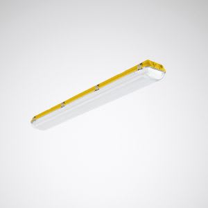 Luminaire LED à vasque étanche, antidéflagrant. Convient pour une utilisation dans des zones qui, en fonctionnement normal, sont rarement exposées à un risque d'explosion par des nuages de poussière inflammables et seulement pendant une courte durée (zone 22). Convient pour une utilisation dans des zones qui, en fonctionnement normal, sont rarement exposées à un risque d'explosion par des gaz, des vapeurs ou des brouillards et seulement pendant une courte durée (zone 2). Pour un montage horizontal ou vertical aux murs et au plafond. Convient également au montage en suspension avec des accessoires à commander séparément. Plaque de fermeture en PC injecté, transparent et stabilisé aux UV. Surface lisse et recouvrement à prismes à l’intérieur, pour une répartition lumineuse optimale. Avec une répartition lambertienne des intensités lumineuses. Lors du montage, le recouvrement à prismes protège le système LED de contacts accidentels. Flux lumineux du luminaire et couleur de la lumière fixes. Flux lumineux du luminaire 6000 lm, puissance raccordée 39 W, Teinte de lumière blanc chaud, température de couleur (CCT) 3000 K, indice général de rendu des couleurs (IRC) Ra > 80. Tolérance de localisation chromatique (initialement MacAdam) ≤ 3 SDCM. Durée de vie assignée moyenne L80 (tq 25 °C) = 100.000 h. La source lumineuse est remplaçable conformément aux exigences d'écoconception (Règlement (UE) 2019/2020). Corps de luminaire en polyester compressé, renforcé par fibres de verre. Surface à revêtement en jaune de sécurité (similaire à RAL 1003). Dimensions (L x l): 1578 mm x 145 mm, hauteur du luminaire 101 mm. Fermeture à levier en acier inoxydable résistant aux acides (V2A). Joints en polyuréthane. Classe électrique (EN 61140) : I, indice de protection (norme EN 60529) : IP66. Température ambiante admissible (ta): -20 °C à 50 °C. Poids: 3.7 kg. Le luminaire convient à un fonctionnement sur un réseau à tension continue 230 V. Avec driver. L'appareillage est remplaçable conformément aux exigences d'écoconception (Règlement (UE) 2019/2020). Le produit répond aux exigences essentielles des directives européennes applicables et de la loi sur la sécurité des produits et porte le marquage CE.