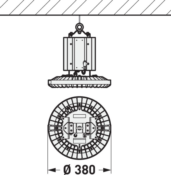 Hublot industriel robuste pour les zones à risque d’explosion. Convient pour une utilisation dans des zones qui, en fonctionnement normal, sont rarement exposées à un risque d'explosion par des nuages de poussière inflammables et seulement pendant une courte durée (zone 22). Convient pour une utilisation dans des zones qui, en fonctionnement normal, sont rarement exposées à un risque d'explosion par des gaz, des vapeurs ou des brouillards et seulement pendant une courte durée (zone 2). Un œillet de fixation est inclus dans la livraison de la version suspendue. Possibilité d’un montage au mur, au plafond, sur un mât ou un tube au moyen d’accessoires à commander séparément. Avec une répartition lambertienne des intensités lumineuses. Flux lumineux du luminaire et couleur de la lumière fixes. Flux lumineux du luminaire 12400 lm, puissance raccordée 80 W, rendement lumineux maximale du luminaire 155 lm/W. Teinte de lumière , température de couleur (CCT) , indice général de rendu des couleurs (IRC) Ra > 80. Tolérance de localisation chromatique (initialement MacAdam) ≤ 3 SDCM. Durée de vie assignée moyenne L80 (tq 25 °C) = 70.000 h. Corps du luminaire en alliage d’aluminium sans cuivre avec une surface résistante aux intempéries et à la corrosion. Surface à revêtement en jaune de sécurité (similaire à RAL 1003). Plaque de recouvrement en verre trempé. Diamètre du luminaire 380 mm, Hauteur du luminaire 390 mm. Classe électrique (EN 61140) : I, indice de protection (norme EN 60529) : IP6667, degré de résistance aux chocs selon la norme CEI 62262 : IK10. Température ambiante admissible (ta): -32 °C à 75 °C. Poids: 8.3 kg. Un raccord à visser (PA) est inclus dans la livraison. Avec appareillage électronique, commutable. Le produit répond aux exigences essentielles des directives européennes applicables et de la loi sur la sécurité des produits et porte le marquage CE.