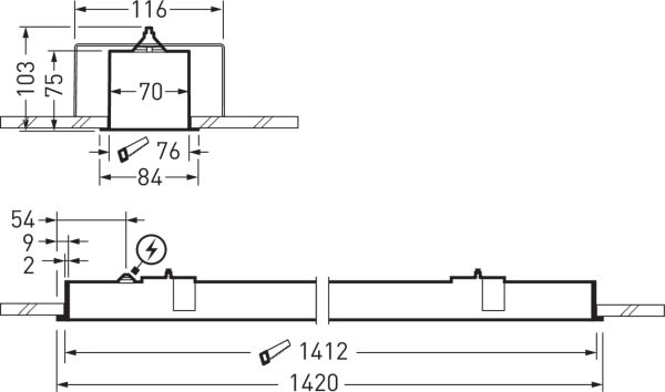 Luminaire individuel du système de canaux lumineux pour une mise en scène architecturale de l’éclairage. Ce luminaire fait partie d’une gamme de luminaires encastrés, de plafonniers et de luminaires suspendus, dont l’aspect est harmonisé. Tous les accessoires indispensables au système (étriers de montage/étriers pivotants et embouts frontaux) sont inclus dans la livraison. Pour des informations détaillées sur les dimensions de montage, nous vous renvoyons aux dernières instructions de montage. Le diffuseur en PMMA opale, finement structuré et à éclairage homogène est monté en affleurement. Avec une répartition lambertienne des intensités lumineuses. Flux lumineux du luminaire et couleur de la lumière fixes. Flux lumineux du luminaire 4759 lm, puissance raccordée 44 W, rendement lumineux maximale du luminaire 108 lm/W. Teinte de lumière blanc neutre, température de couleur (CCT) 4000 K, indice général de rendu des couleurs (IRC) Ra > 80. Tolérance de localisation chromatique (initialement MacAdam) ≤ 3 SDCM. Durée de vie assignée moyenne L90 (tq 25 °C) = 50.000 h., Durée de vie assignée moyenne L80 (tq 25 °C) = 100.000 h. La source lumineuse est remplaçable conformément aux exigences d'écoconception (Règlement (UE) 2019/2020). Éléments de canal en profilé extrudé d’aluminium, embouts frontaux en plastique (PMMA). Surface à revêtement blanc (similaire à RAL 9016). Dimensions (L x l): 1420 mm x 84 mm, hauteur du luminaire 75 mm. Classe électrique (EN 61140) : I, indice de protection (norme EN 60529) : IP20, degré de résistance aux chocs selon la norme CEI 62262 : IK03, température d’essai au fil incandescent selon la norme CEI 60695-2-11 : 650 °C. Température ambiante admissible (ta): 25 °C . Poids: 3.3 kg. Le raccordement au réseau s'effectue au moyen d'une borne à 5 pôles jusqu'à 1,5 mm2. Avec driver. L'appareillage est remplaçable conformément aux exigences d'écoconception (Règlement (UE) 2019/2020). Le produit répond aux exigences essentielles des directives européennes applicables et de la loi sur la sécurité des produits et porte le marquage CE.