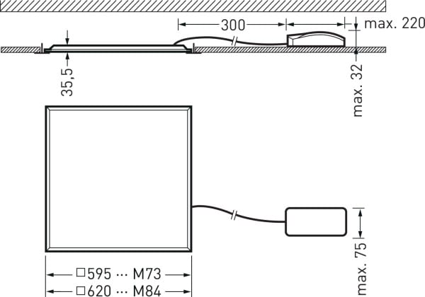 Luminaire encastré LED avec recouvrement microprismatique. Version M73 (600 mm x 600 mm). La surface prismatique en PMMA du système optique a un effet anti-éblouissement. À répartition symétrique limitée et extensive des intensités lumineuses. Taux d'éblouissement selon classification UGR (EN 12464-1) < 19. Compatible avec les écrans informatiques selon la norme EN 12464-1 grâce à des luminosités réduites L ≤ 3 000 cd/2 pour des angles d’éclairage supérieurs à 65 °, de manière omnidirectionnelle. Effet lumineux harmonieux grâce à une sortie de lumière uniformément éclairée. Flux lumineux du luminaire et couleur de la lumière fixes. Flux lumineux du luminaire 3400 lm, puissance raccordée 31 W, rendement lumineux maximale du luminaire 110 lm/W. Teinte de lumière blanc chaud, température de couleur (CCT) 3000 K, indice général de rendu des couleurs (IRC) Ra > 80. Tolérance de localisation chromatique (initialement MacAdam) ≤ 4 SDCM. Durée de vie assignée moyenne L80(tq 25 °C) = 50.000 h. La source lumineuse est remplaçable conformément aux exigences d'écoconception (Règlement (UE) 2019/2020). Cadre en aluminium, face arrière du corps de luminaire en tôle d’acier. Surface revêtue de blanc (RAL 9016). Dimensions (L x l): 595 mm x 595 mm, hauteur du luminaire 35.5 mm. Classe électrique (EN 61140) : I, indice de protection (norme EN 60529) : IP20, degré de résistance aux chocs selon la norme CEI 62262 : IK03, température d’essai au fil incandescent selon la norme CEI 60695-2-11 : 650 °C. Poids: 2.1 kg. Avec driver externe. L'appareillage est remplaçable conformément aux exigences d'écoconception (Règlement (UE) 2019/2020). Le produit répond aux exigences essentielles des directives européennes applicables et de la loi sur la sécurité des produits et porte le marquage CE. Le luminaire est en outre certifié ENEC par un organisme de contrôle indépendant.