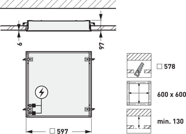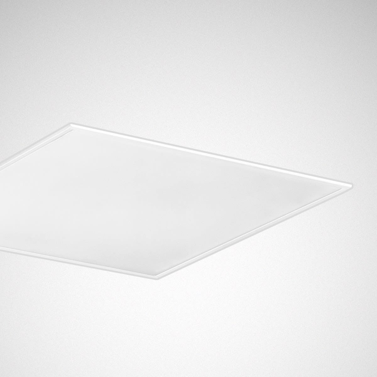 Luminaire encastré carré pour locaux humides. Version M73 (600 mm x 600 mm). Convient pour une utilisation dans les entreprises certifiées HACCP, IFS et/ou BRC Global Standard Food. Avec température de surface limitée (DIN EN 60598-2-24, identifiant D). Fixation du luminaire au moyen de quatre étriers pivotants intégrés. Vasque en PMMA translucide, Degré de transmission supérieur à 80 %. Avec une répartition lambertienne des intensités lumineuses. Effet de lumière homogène. Flux lumineux du luminaire et couleur de la lumière fixes. Flux lumineux du luminaire 5500 lm, puissance raccordée 38 W, rendement lumineux maximale du luminaire 145 lm/W. Teinte de lumière blanc neutre, température de couleur (CCT) 4000 K, indice général de rendu des couleurs (IRC) Ra > 90. Tolérance de localisation chromatique (initialement MacAdam) ≤ 3 SDCM. Durée de vie assignée moyenne L80 (tq 40 °C) = 100.000 h., Durée de vie assignée moyenne L90 (tq 25 °C) = 100.000 h. La source lumineuse est remplaçable conformément aux exigences d'écoconception (Règlement (UE) 2019/2020). Corps du luminaire en tôle d’acier galvanisé. Surface à laquage par poudre, blanc Dimensions (L x l): 597 mm x 597 mm, hauteur du luminaire 94 mm. L’étanchéité de l’espace au plafond est réalisée par un joint périphérique en mousse polyuréthane. Classe électrique (EN 61140) : I, indice de protection (norme EN 60529) : IP54, degré de résistance aux chocs selon la norme CEI 62262 : IK04, température d’essai au fil incandescent selon la norme CEI 60695-2-11 : 650 °C. Température ambiante admissible (ta): 40 °C Poids: 7.3 kg. Avec appareillage électronique, à gradation numérique (DALI). Appareillage conf. au standard DALI 2 (EN 62386). Possibilité de commutation et de gradation du luminaire au moyen de la fonction bouton-poussoir via les bornes de commande DALI (TouchDim). L'appareillage est remplaçable conformément aux exigences d'écoconception (Règlement (UE) 2019/2020). Ce luminaire qui est prêt au monitoring (MOR) fournit des données d’exploitation permettant une surveillance ou une maintenance prédictive, il est donc compatible avec les services de TRILUX Monitoring Services. Le produit répond aux exigences essentielles des directives européennes applicables et de la loi sur la sécurité des produits et porte le marquage CE. Le luminaire est en outre certifié ENEC par un organisme de contrôle indépendant.