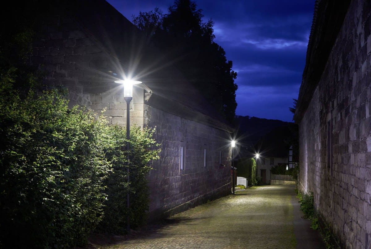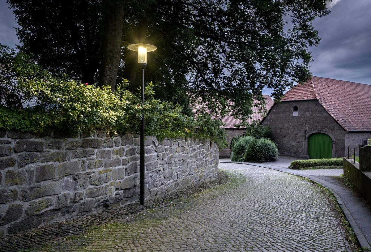 Lanterne LED décorative pour montage sur mât droit. Avec réduction de la puissance autonome via la phase de commande. Système optique réalisé en technologie Multi Lens. Optique du luminaire composée d’un système de lentilles hautement efficace, résistant aux UV et aux températures extrêmes. À répartition à symétrie en rotation extensive des intensités lumineuses. D’autres faisceaux sont disponibles pour une adaptation flexible à des tâches d’éclairage personnalisées client. Le montage ultérieur d'un blindage arrière / latéral est possible en tant qu'accessoire à commander séparément. Flux lumineux du luminaire et couleur de lumière fixes, avec maintien du flux lumineux en fin de vie (CLO). Système LED comprenant 3 modules LED. Flux lumineux du luminaire 1800 lm, puissance raccordée 15 W, rendement lumineux maximale du luminaire 120 lm/W. Teinte de lumière blanc chaud, température de couleur (CCT) 3000 K, indice général de rendu des couleurs (IRC) Ra > 70. Tolérance de localisation chromatique (initialement MacAdam) ≤ 5 SDCM. Autres couleurs de lumière LED disponibles sur demande. Durée de vie assignée moyenne LCLO(tq 25 °C) = 100.000 h. La source lumineuse est remplaçable conformément aux exigences d'écoconception (Règlement (UE) 2019/2020). Sur demande : versions dotées d’un interrupteur trois positions pour le réglage de différents flux lumineux. Corps de luminaire en aluminium moulé sous pression, toit de luminaire en aluminium résistant à la corrosion, haute résistance aux intempéries, revêtement poudré. Couleur extérieure du corps et du toit de luminaire : noir profond analogue à RAL 9005. Toit du luminaire, blanc à l’intérieur, revêtement poudré. Revêtement convenant à un climat maritime, sur demande. Cylindre de fermeture en PMMA à haute résistante aux chocs, clair. Recouvrement de luminaire pouvant être glissé vers le haut dans une position de service autobloquante. Classe électrique (EN 61140) : II, indice de protection (norme EN 60529) : IP23, Indice de protection du compartiment de la lampe: IP65. degré de résistance aux chocs selon la norme CEI 62262 : IK04. Indice de protection du compartiment de la lampe: IP65. Mât disponible sur demande. Surface exposée au vent Fw 0.470 m2. Poids: 9.9 kg. Avec driver. L'appareillage est remplaçable conformément aux exigences d'écoconception (Règlement (UE) 2019/2020). Avec câble d’alimentation raccordé de 6 000 mm. Avec point d’appui isolé pour le fil de terre. Bloc électrique avec tous ses composants électriques, remplaçables sans outil. Résistance aux pics de tension Mode différentiel / mode commun : 6 kV / 10 kV. Le produit répond aux exigences essentielles des directives européennes applicables et de la loi sur la sécurité des produits et porte le marquage CE. Le luminaire est en outre certifié ENEC par un organisme de contrôle indépendant.
