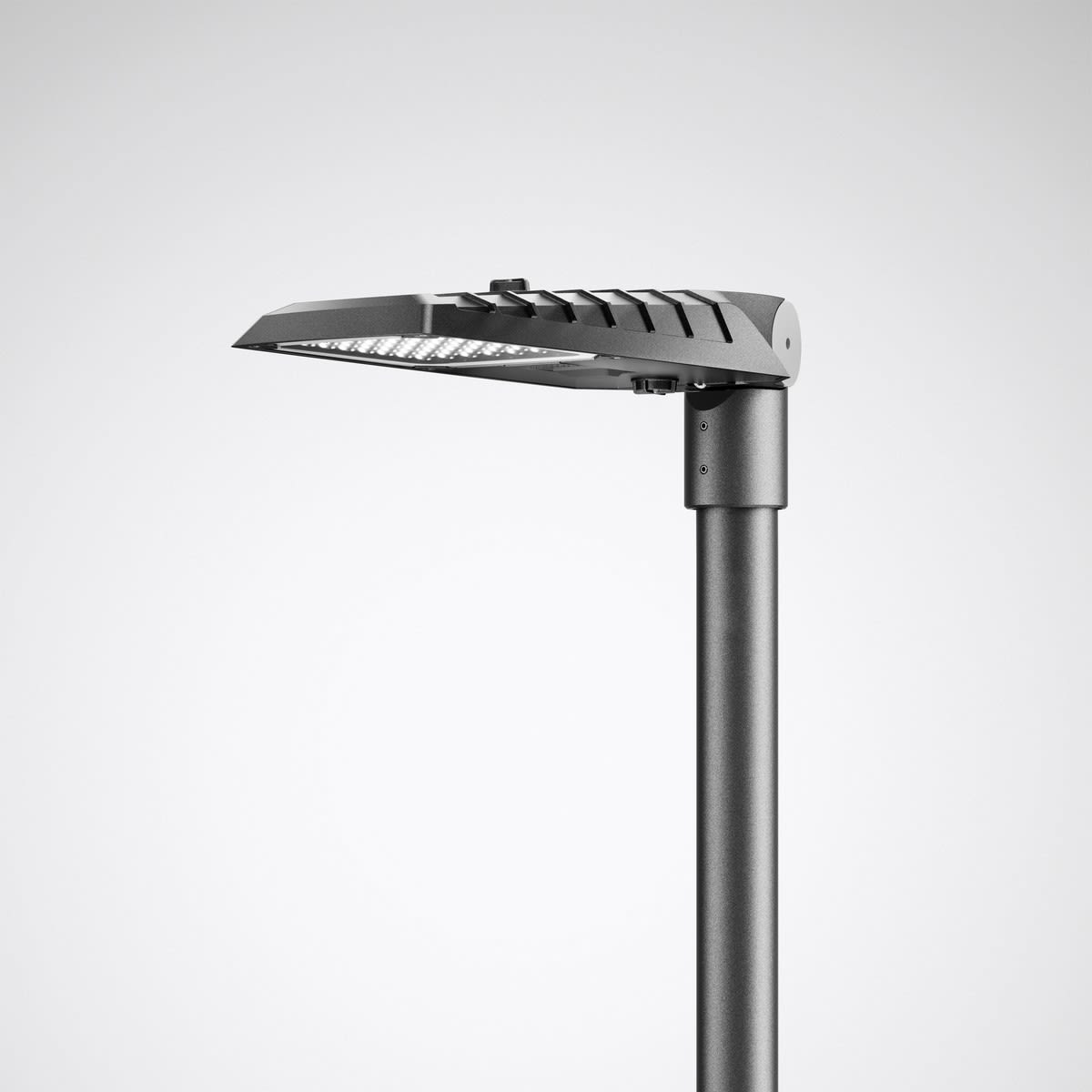 Luminaire pour mât droit et crosse avec lignes claires et silhouette attrayante. Avec réduction de la puissance autonome via la phase de commande. Avec équipement SLR (Smart Lighting Ready). Socle Zhaga sur la tête du luminaire en haut et en bas. Le luminaire conçu pour la norme D4i est certifié Zhaga/D4i. Le montage mural est possible grâce à un accessoire à commander séparément.. En version MLT (Technologie Multi Lens), composé de systèmes de lentilles hautement efficaces, résistants aux UV et aux températures extrêmes, en montage quadruple. À répartition asymétrique extensive des intensités lumineuses. D’autres faisceaux sont disponibles pour une adaptation flexible à des tâches d’éclairage personnalisées client. Le montage ultérieur d'un blindage arrière / latéral est possible en tant qu'accessoire à commander séparément. Flux lumineux du luminaire et couleur de lumière fixes, avec maintien du flux lumineux en fin de vie (CLO). Système LED composé de 8 modules MLT LED, équipés chacun de 4 LED. Flux lumineux du luminaire 7500 lm, puissance raccordée 64 W, rendement lumineux maximale du luminaire 117 lm/W. Teinte de lumière blanc chaud, température de couleur (CCT) 2200 K, Disponible sur demande également en version Tunable White (2200 K – 4000 K). indice général de rendu des couleurs (IRC) Ra > 70. Tolérance de localisation chromatique (initialement MacAdam) ≤ 5 SDCM. Durée de vie assignée moyenne LCLO (tq 25 °C) = 100.000 h. La source lumineuse est remplaçable conformément aux exigences d'écoconception (Règlement (UE) 2019/2020). Le flux lumineux de référence du luminaire peut être réduit de 50% grâce à l'application et à la NFC (Near Field Communication). À l'état de livraison, 100% du flux lumineux de référence est réglé. Corps de luminaire en aluminium moulé sous pression. Pivot en ASA résistant aux UV et aux intempéries. Corps du luminaire (couleur primaire) et point de rotation (couleur supplémentaire) de couleur contrastée. Couleur primaire anthracite (similaire à DB 703), couleur supplémentaire gris argent (similaire à RAL 9006). À effet métallique, haute résistance aux intempéries. Le revêtement des éléments de fixation est de la couleur du boîtier. Recouvrement du boîtier ballast, en aluminium moulé sous pression, à ouvrir sans outil via sa fermeture à genouillère. Le bloc électrique peut être retiré sans outil.. Le diffuseur interchangeable en verre de sécurité simple, traité thermiquement est fixé en toute sécurité au boîtier du luminaire par quatre éléments de fixation en acier inoxydable. Le recouvrement dispose d’un joint en polyuréthane résistant aux UV. Revêtement convenant à un climat maritime, sur demande. Mât disponible sur demande. Classe électrique (EN 61140) : II, indice de protection (norme EN 60529) : IP66, degré de résistance aux chocs selon la norme CEI 62262 : IK09. Température ambiante admissible (ta): -40 °C à 25 °C. Surface exposée au vent Fw 0.140 m2. Poids: 8.1 kg. Câble d’alimentation raccordé de 10 000 mm. Avec appareillage électronique, commutable. L'appareillage est remplaçable conformément aux exigences d'écoconception (Règlement (UE) 2019/2020).