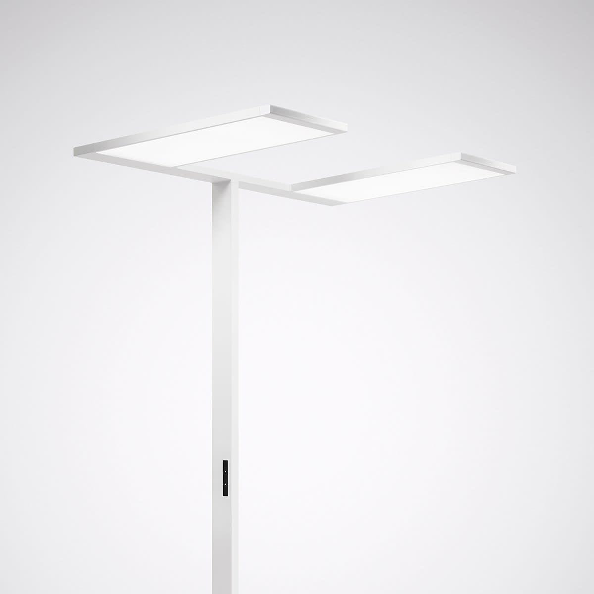 Luminaire sur pied LED exclusif, disposant de 2 têtes de luminaire, commandables séparément, à répartition directe/indirecte. Convenant à un éclairage conforme aux normes, de doubles postes de travail en vis-à-vis, notamment si ces derniers sont dotés de cloisons de séparation les isolant. Grâce à sa répartition extensive des intensités lumineuses, légèrement asymétrique, la composante directe du luminaire a pour effet un éclairage très uniforme de la surface du bureau. La composante indirecte à répartition de la lumière lambertienne a pour effet un éclairage intérieur optimal. À répartition symétrique limitée et extensive des intensités lumineuses. Taux d'éblouissement selon classification UGR (EN 12464-1) < 19. Compatible avec les postes de travail informatisés selon la norme EN 12464­1 Flux lumineux du luminaire et couleur de la lumière fixes. Flux lumineux du luminaire 17400 lm, puissance raccordée 124 W, rendement lumineux maximale du luminaire 140 lm/W. Teinte de lumière blanc neutre, température de couleur (CCT) 4000 K, indice général de rendu des couleurs (IRC) Ra > 80. Tolérance de localisation chromatique (initialement MacAdam) ≤ 3 SDCM. Durée de vie assignée moyenne L80 (tq 25 °C) = 100.000 h. La source lumineuse est remplaçable conformément aux exigences d'écoconception (Règlement (UE) 2019/2020). Corps de luminaire en profilé d’aluminium extrudé et en aluminium moulé sous pression. Pied du luminaire en U. Surface à revêtement blanc (similaire à RAL 9016). Autres couleurs disponibles sur demande. Hauteur du luminaire: 2000 mm, Longueur/largeur du pied support: 550 mm / 550 mm, Longueur/largeur de la tête de luminaire: 1080 mm x 710 mm, Hauteur de la tête du luminaire: 23 mm. Dimensions du tube de support: 80 mm x 80 mm. Classe électrique (EN 61140) : I, indice de protection (norme EN 60529) : IP20, degré de résistance aux chocs selon la norme CEI 62262 : IK02, température d’essai au fil incandescent selon la norme CEI 60695-2-11 : 650 °C. Température ambiante admissible (ta): 25 °C Poids: 25.2 kg. Raccordement au moyen d’un câble d’alimentation flexible 3 x 1 mm2 (fiche avec contact de protection et prise avec terre C14), longueur env. 3 000 mm. Fiche avec contact de protection compatible avec des prises de courant de type E et de type F. Modèle de connecteur : Coudé. Types alternatifs de connecteurs disponibles : Fiche de raccordement de type J SEV, Suisse, Fiche de raccordement type BS, British Standard 1363. Avec câble d’alimentation. Avec 2 appareillages électronique, dimmables (DALI). Appareillage conf. au standard DALI 2 (EN 62386). Possibilité de commutation et de gradation du luminaire au moyen de la fonction bouton-poussoir via les bornes de commande DALI (TouchDim). L'appareillage est remplaçable conformément aux exigences d'écoconception (Règlement (UE) 2019/2020). Le commutateur à deux support permet une commutation/gradation séparée des composantes directe et indirecte.